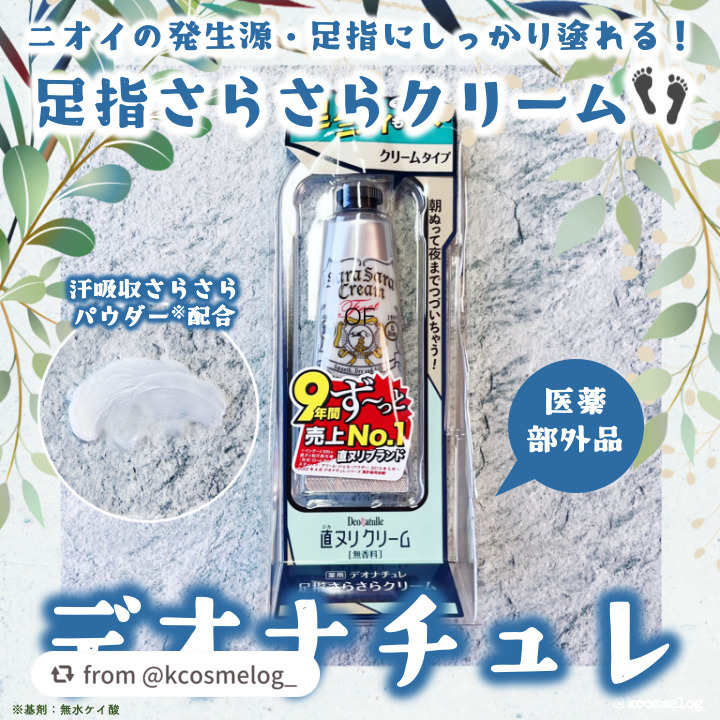 - \11年間ず~っと売上No.1*直ヌリ制汗デオドラントブランド/ 『防臭力のデオナチュレ』シリーズから、足特有のムレ・ニオイを防ぐ足用処方「薬用デオナチュレ足指さらさらクリーム」 ◆◆靴、脱ぐの⁈とドキッとすること、ありませんか?◆◆ 足は1日コップ約1杯分の汗をかき、ムレて、ニオイやすい だから、デオナチュレの足用でケア! ◆◆ユーザーから選ばれる理由◆◆ 1.天然アルム石に着目。有効成分「焼ミョウバン」を配合し、汗・ニオイを元から防ぐ! 足汗吸収さらさらパウダー**やティーツリーハーブ・ローズマリーエキス***を配合 2.ニオイの発生源に“直ヌリ”で、朝ぬって夜まで続いちゃう! 3.クリームなのに、ベタつかず・白残りしにくい ==注意== ●顔・粘膜を避け、除脱毛直後や肌に異常があるときは使用しないでください。●肌に異常が生じていないかよく注意してご使用ください。また、お肌に合わないとき、使用中に赤み、はれ、かゆみ、刺激、色抜け(白班等)や黒ずみ等の異常があらわれたときは、使用を中止し、皮フ科専門医などにご相談ください。●使用後はキャップをしっかり閉め、直射日光や高温多湿を避けて保管してください。●乳幼児の手の届かないところに置いてください。●床、靴、衣類などにつかないようご注意ください。 販売名:DN薬用フットクリームFc *インテージSRI+直ヌリ制汗剤市場(形状:ロールオン・スティック・クリーム・ジェル・パウダー) 2013年5月~2024年4月 デオナチュレシリーズ 累計販売金額 **基剤:無水ケイ酸 ***保湿成分
