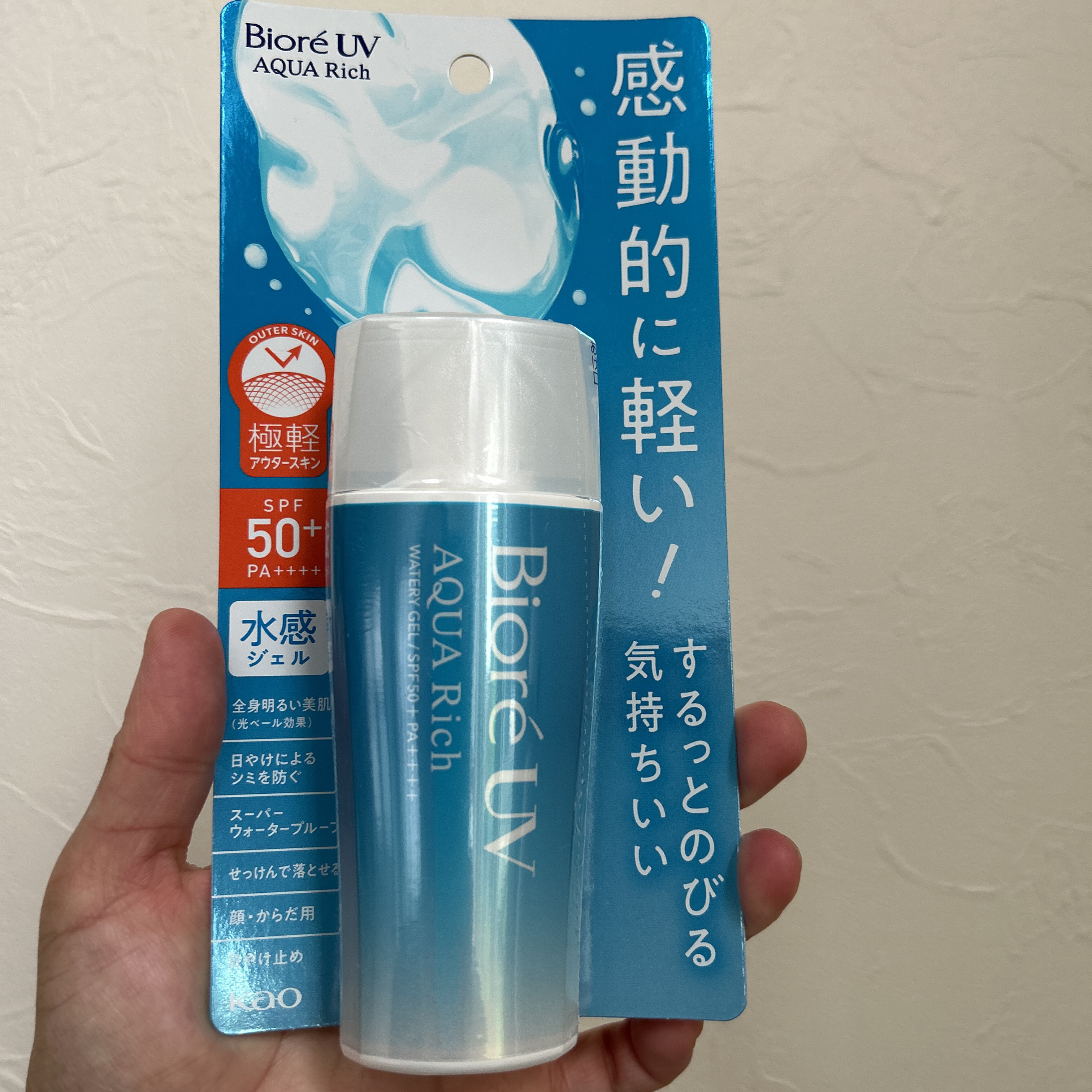- 塗り直しても、重ねても感動的に軽い!水感UV。ミクロレベルのスキマまで塗りムラ防ぐ。化粧下地にも。ファンデーションもなめらかな仕上がり。日やけによるシミ、そばかすを防ぐ。スーパーウォータープルーフ(80分間の耐水試験で確認済み)。せっけんで落とせる。顔・からだ用。SPF50+/PA++++。白浮きしにくく、ベタつきにくい。ヒアルロン酸・ローヤルゼリーエキス・BG配合(保湿成分)