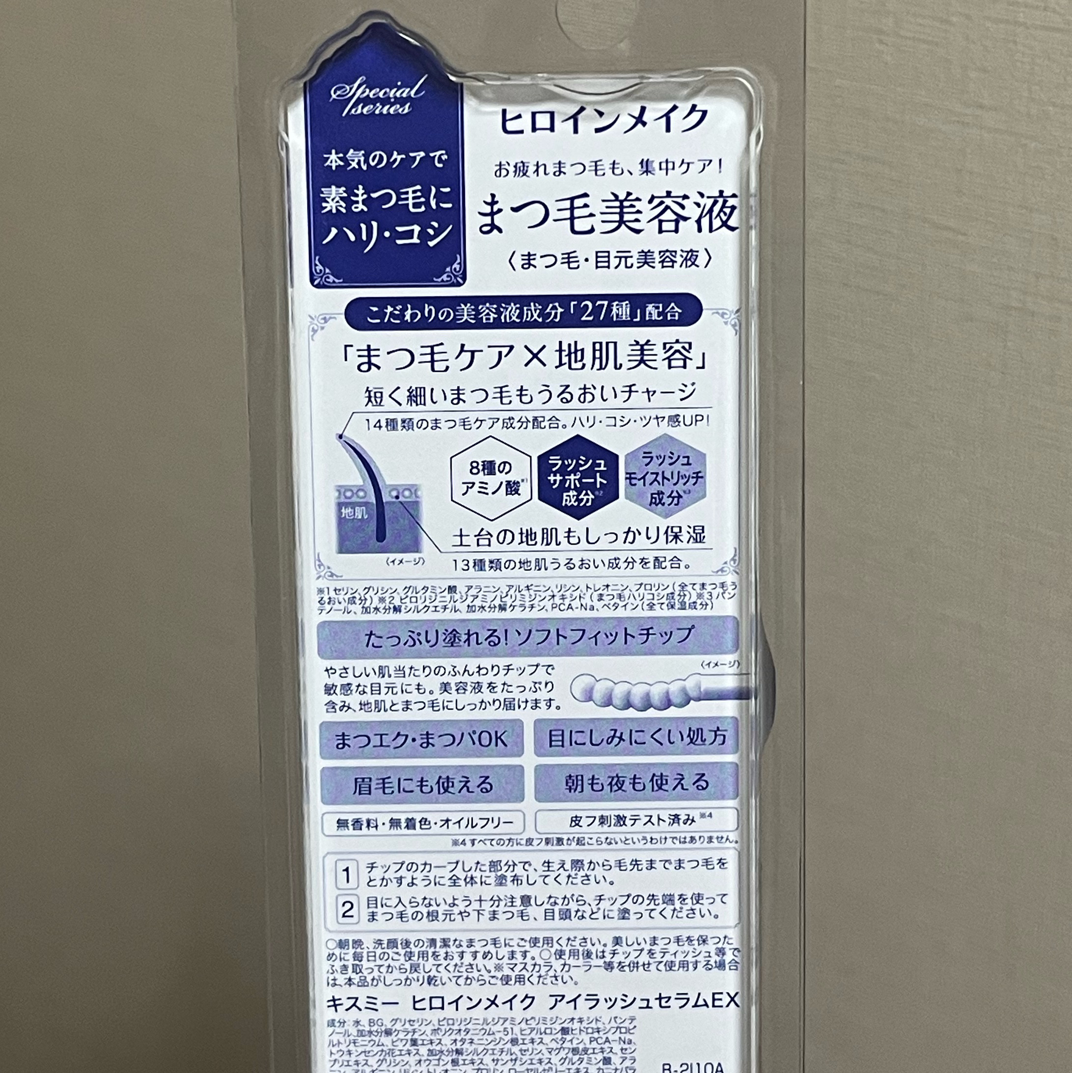 - ●こだわりの27種の美容液成分(全て保湿成分)配合。本気のケアで素まつ毛にハリ・コシを。 ●たっぷり塗れる!ソフトフィットチップを採用。液含みがよく、やさしい肌当たりのふんわりチップで、地肌とまつ毛にしっかりと塗布することができます。 ●まつエク・まつパOK ●眉毛にも使える ●目にしみにくい処方 ●無香料・無着色・オイルフリー ●皮フ刺激テスト※済み ※ すべての方に皮フ刺激が起こらないというわけではありません。