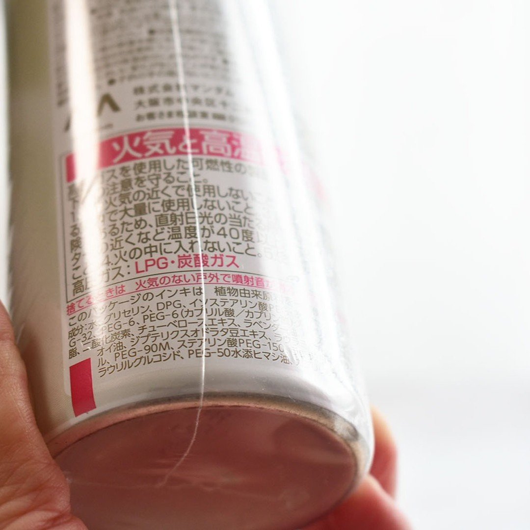 - <90g> 水、グリセリン、DPG、イソステアリン酸PEG-8グリセリル、ラウリン酸ポリグリセリル-10、イソブタン、PEG-32、PEG-6、PEG-6(カプリル酸/カプリン酸)グリセリズ、ソルビトール、カプリル酸ポリグリセリル-3、シア脂、二酸化炭素、チューベロースエキス、ラベンダー油、ローズマリー葉油、エンピツビャクシン油、ニオイテンジクアオイ油、ジプテリクスオドラタ豆エキス、ラウラミドプロピルベタイン、ラウレス硫酸Na、ミリスチルアルコール、PEG-90M、ステアリン酸PEG-150、ラウラミドプロピルヒドロキシスルタイン、コカミドメチルMEA、ラウリルグルコシド、PEG-50水添ヒマシ油、カプリリルグリコール、クエン酸トリエチル、フェノキシエタノール