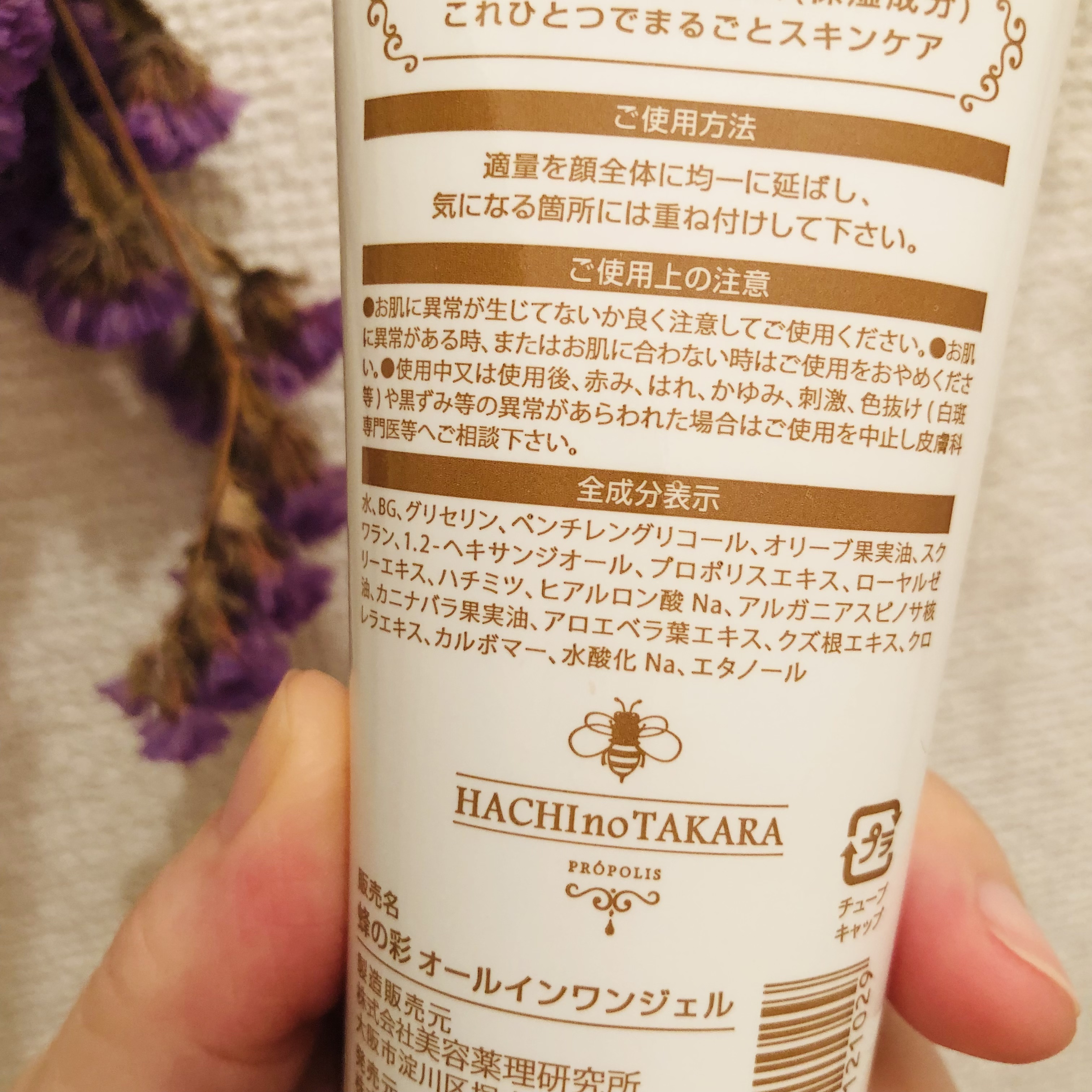 - 水、BG、グリセリン、ペンチレングリコール、オリーブ果実油、スクワラン、1.2-ヘキサンジオール、プロポリスエキス、ローヤルゼリーエキス、ハチミツ、ヒアルロン酸Na、アルガニアスピノサ核油、カニナバラ果実油、アロエベラ葉エキス、クズ根エキス、クロレラエキス、カルボマー、水酸化Na、エタノール