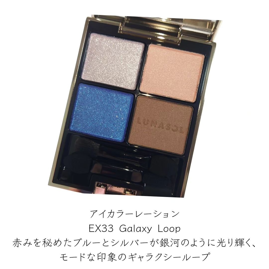 今日のアイシャドウ🌌LUNASOL🌝アイカラーレーションEX33GalaxyLoop限定色大人っぽいブルーラベンダーみたいなカラー赤みを秘めたブルーとシルバーが銀河のように光り輝く、モードな印象のギャラクシーループ心を奪う鮮烈な色がまぶたに溶...