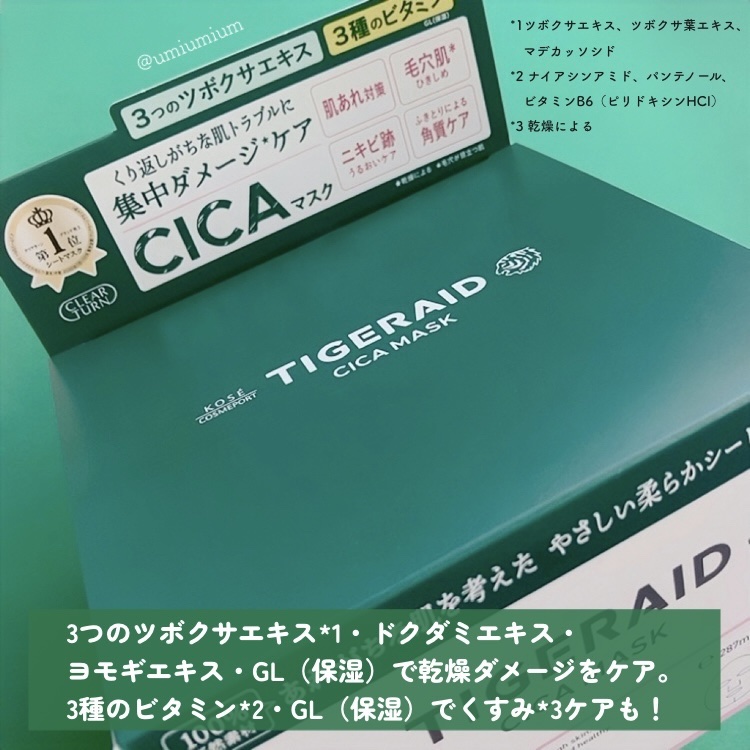 - 毎日の素肌ダメージ※を集中ケア※²するCICAマスク。 みずみずしい美容液が角層のすみずみまで浸透し、ダメージ※をうけやすい肌もすこやかに保ちます。 ※乾燥、肌荒れ ※²保湿することにより、肌荒れを防ぐこと