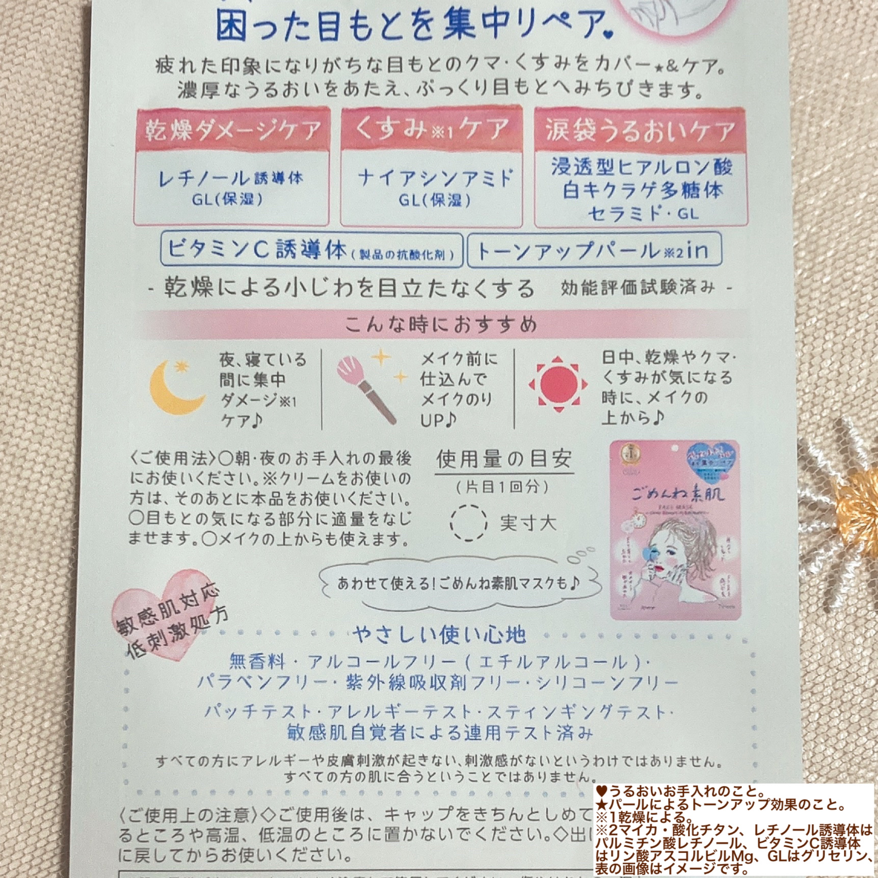 - 好調なごめんね素肌シリーズから、 若年層の目もと悩みを徹底ケアするアイクリームを新発売! ❶あらゆる目もと悩みを集中ケア!〈 乾燥ダメージ+くすみ※+涙袋うるおいケア 〉 濃厚なクリームで、乾燥やくすみ※の気にならない、ぷっくりうるおった目もとへみちびきます。 【乾燥ダメージケア】レチノール誘導体(保湿) 【くすみ※ケア】ナイアシンアミド・ビタミンC誘導体(保湿) 【涙袋うるおいケア】浸透型ヒアルロン酸・白キクラゲ多糖体・セラミド(保湿) ❷うるおいをあたえながら、クマ・くすみもカバー !※2すっぴんからキレイな目もとへ トーンアップパール配合!クマやくすみをナチュラルにカバーします。※2 ❸皮膚が薄く、デリケートな目もとにもやさしい使い心地 【低刺激処方】弱酸性 無香料 無鉱物油 アルコールフリー パラベンフリー(防腐剤) 紫外線吸収剤フリー シリコーンフリー 【各種試験済み】パッチテスト アレルギーテスト スティンギングテスト 敏感肌自覚者による連用テスト 乾燥小じわの効能評価試験済み (全ての方に、刺激やアレルギーなどが起きないというわけではありません) ※乾燥による ※2パールによるトーンアップ(メイク)効果のこと