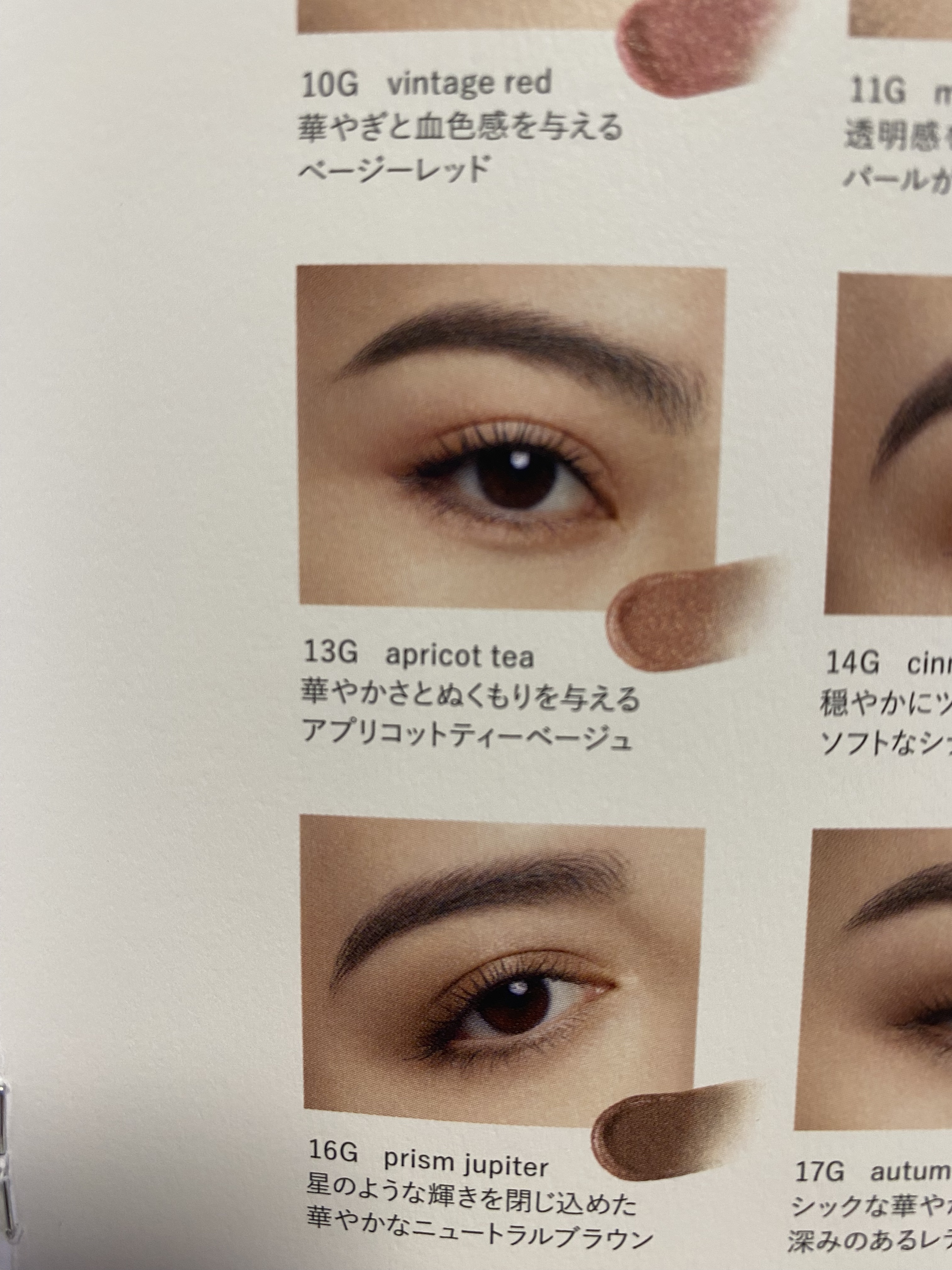 - <01G twinkle sand> シクロメチコン、合成フルオロフロゴパイト、ジフェニルジメチコン、(ジメチコン/ビニルジメチコン)クロスポリマー、イソドデカン、トリメチルシロキシケイ酸、ジメチコン、アストロカリウムムルムル種子脂、ゼニアオイエキス、ダマスクバラ花エキス、トコフェロール、マツリカ花エキス、レモン果実エキス、BG、BHT、TEA、(HDI/トリメチロールヘキシルラクトン)クロスポリマー、イソステアリン酸デキストリン、エタノール、エチルヘキサン酸セチル、キサンタンガム、シリカ、ジメチルシリル化シリカ、スクワラン、ステアリン酸イヌリン、セルロース、テトラ(ジ-t-ブチルヒドロキシヒドロケイヒ酸)ペンタエリスリチル、トリ(カプリル酸/カプリン酸)グリセリル、トリイソステアリン酸イソプロピルチタン、トリエチルヘキサノイン、ハイドロゲンジメチコン、ポリプロピレン、ミネラルオイル、合成ワックス、酸化スズ、水、水酸化Al、水添ポリ(C6-20オレフィン)、水添レシチン、麻セルロース、フェノキシエタノール、香料、オキシ塩化ビスマス、グンジョウ、マイカ、酸化チタン、酸化鉄 <02G dizzy mirage> 合成フルオロフロゴパイト、シクロメチコン、ジフェニルジメチコン、(ジメチコン/ビニルジメチコン)クロスポリマー、イソドデカン、トリメチルシロキシケイ酸、ジメチコン、アストロカリウムムルムル種子脂、ゼニアオイエキス、ダマスクバラ花エキス、トコフェロール、マツリカ花エキス、レモン果実エキス、BG、BHT、TEA、(HDI/トリメチロールヘキシルラクトン)クロスポリマー、イソステアリン酸デキストリン、エタノール、エチルヘキサン酸セチル、キサンタンガム、シリカ、ジメチルシリル化シリカ、スクワラン、ステアリン酸イヌリン、セルロース、テトラ(ジ-t-ブチルヒドロキシヒドロケイヒ酸)ペンタエリスリチル、トリ(カプリル酸/カプリン酸)グリセリル、トリイソステアリン酸イソプロピルチタン、トリエチルヘキサノイン、ハイドロゲンジメチコン、ポリプロピレン、ミネラルオイル、合成ワックス、酸化スズ、水、水酸化Al、水添ポリ(C6-20オレフィン)、水添レシチン、麻セルロース、フェノキシエタノール、香料、オキシ塩化ビスマス、グンジョウ、マイカ、酸化チタン、酸化鉄 <03G romantic crush> 合成フルオロフロゴパイト、シクロメチコン、ジフェニルジメチコン、(ジメチコン/ビニルジメチコン)クロスポリマー、イソドデカン、トリメチルシロキシケイ酸、ジメチコン、ホウケイ酸(Ca/Al)、アストロカリウムムルムル種子脂、ゼニアオイエキス、ダマスクバラ花エキス、トコフェロール、マツリカ花エキス、レモン果実エキス、BG、BHT、TEA、(HDI/トリメチロールヘキシルラクトン)クロスポリマー、イソステアリン酸デキストリン、エタノール、エチルヘキサン酸セチル、キサンタンガム、シリカ、ジメチルシリル化シリカ、スクワラン、ステアリン酸イヌリン、セルロース、テトラ(ジ-t-ブチルヒドロキシヒドロケイヒ酸)ペンタエリスリチル、トリ(カプリル酸/カプリン酸)グリセリル、トリイソステアリン酸イソプロピルチタン、トリエチルヘキサノイン、トリエトキシカプリリルシラン、ハイドロゲンジメチコン、ポリプロピレン、ミネラルオイル、合成ワックス、酸化スズ、水、水酸化Al、水添ポリ(C6-20オレフィン)、水添レシチン、麻セルロース、フェノキシエタノール、香料、オキシ塩化ビスマス、グンジョウ、マイカ、酸化チタン、酸化鉄 <04G gold glint> 合成フルオロフロゴパイト、シクロメチコン、ジフェニルジメチコン、(ジメチコン/ビニルジメチコン)クロスポリマー、イソドデカン、トリメチルシロキシケイ酸、ジメチコン、ホウケイ酸(Ca/Al)、アストロカリウムムルムル種子脂、ゼニアオイエキス、ダマスクバラ花エキス、トコフェロール、マツリカ花エキス、レモン果実エキス、BG、BHT、TEA、(HDI/トリメチロールヘキシルラクトン)クロスポリマー、イソステアリン酸デキストリン、エタノール、エチルヘキサン酸セチル、キサンタンガム、シリカ、ジメチルシリル化シリカ、スクワラン、ステアリン酸イヌリン、セルロース、テトラ(ジ-t-ブチルヒドロキシヒドロケイヒ酸)ペンタエリスリチル、トリ(カプリル酸/カプリン酸)グリセリル、トリイソステアリン酸イソプロピルチタン、トリエチルヘキサノイン、ハイドロゲンジメチコン、ポリプロピレン、ミネラルオイル、ラウリン酸亜鉛、合成ワックス、酸化スズ、水、水酸化Al、水添ポリ(C6-20オレフィン)、水添レシチン、麻セルロース、フェノキシエタノール、香料、オキシ塩化ビスマス、グンジョウ、マイカ、酸化チタン、酸化鉄 <05G peach bloom> シクロメチコン、合成フルオロフロゴパイト、ジフェニルジメチコン、(ジメチコン/ビニルジメチコン)クロスポリマー、イソドデカン、トリメチルシロキシケイ酸、ジメチコン、アストロカリウムムルムル種子脂、ゼニアオイエキス、ダマスクバラ花エキス、トコフェロール、マ