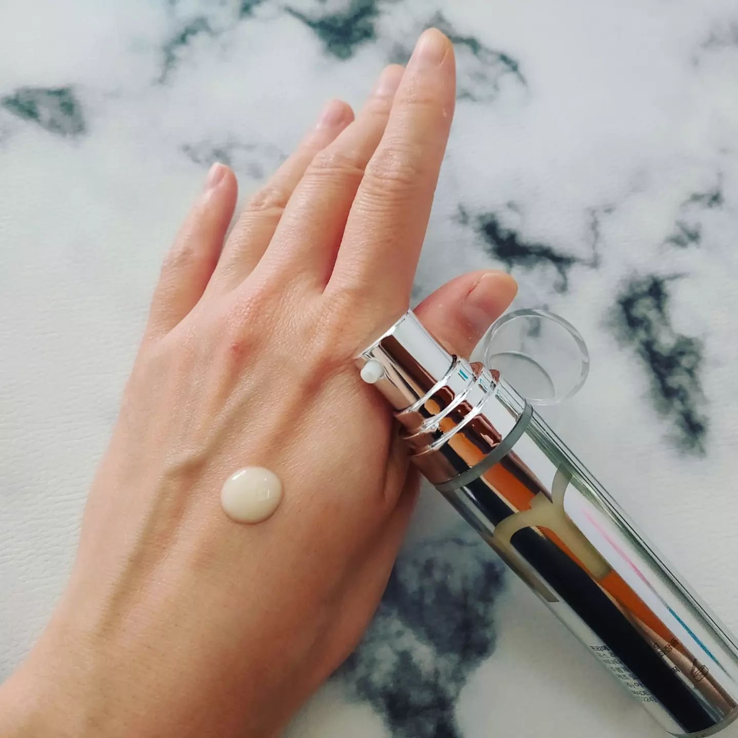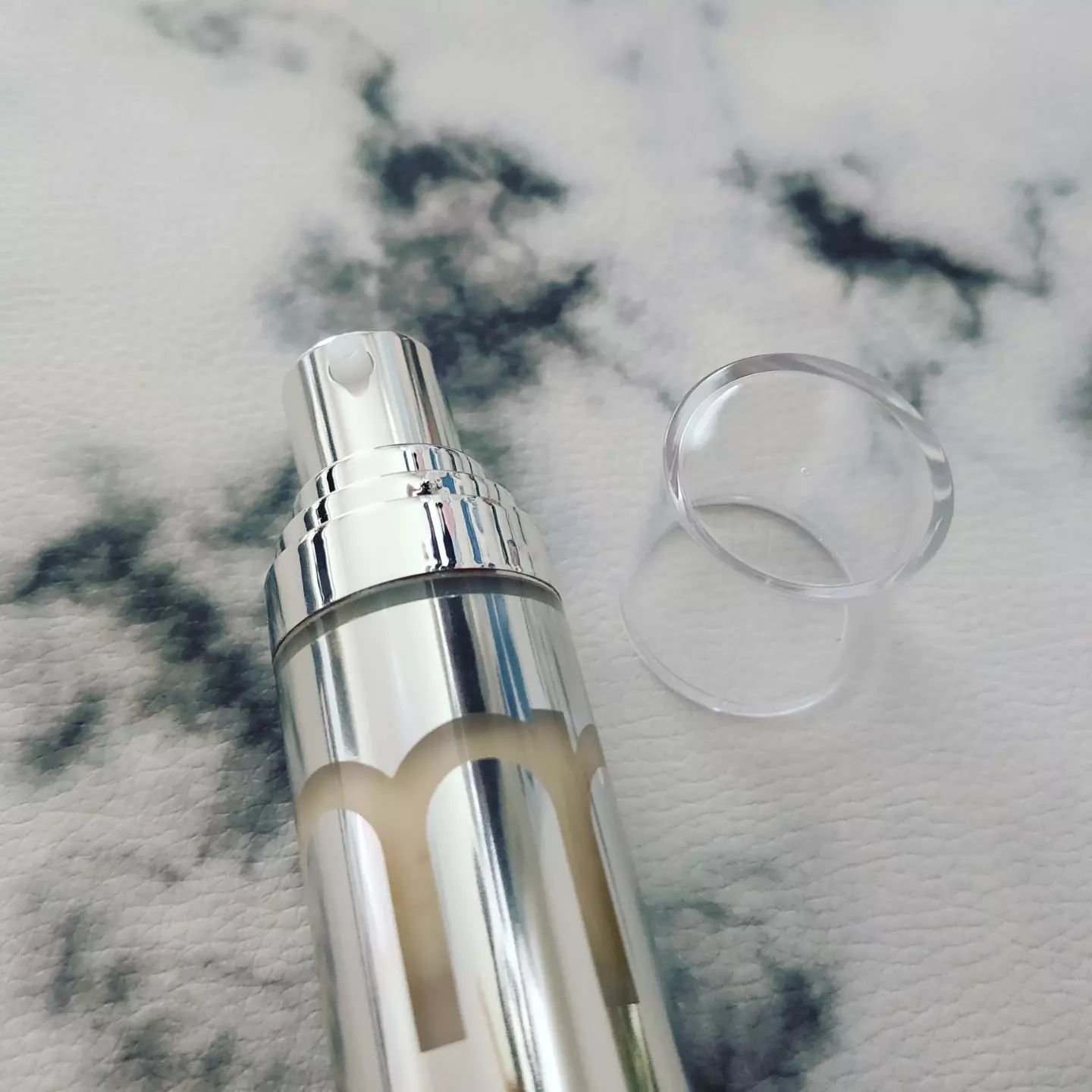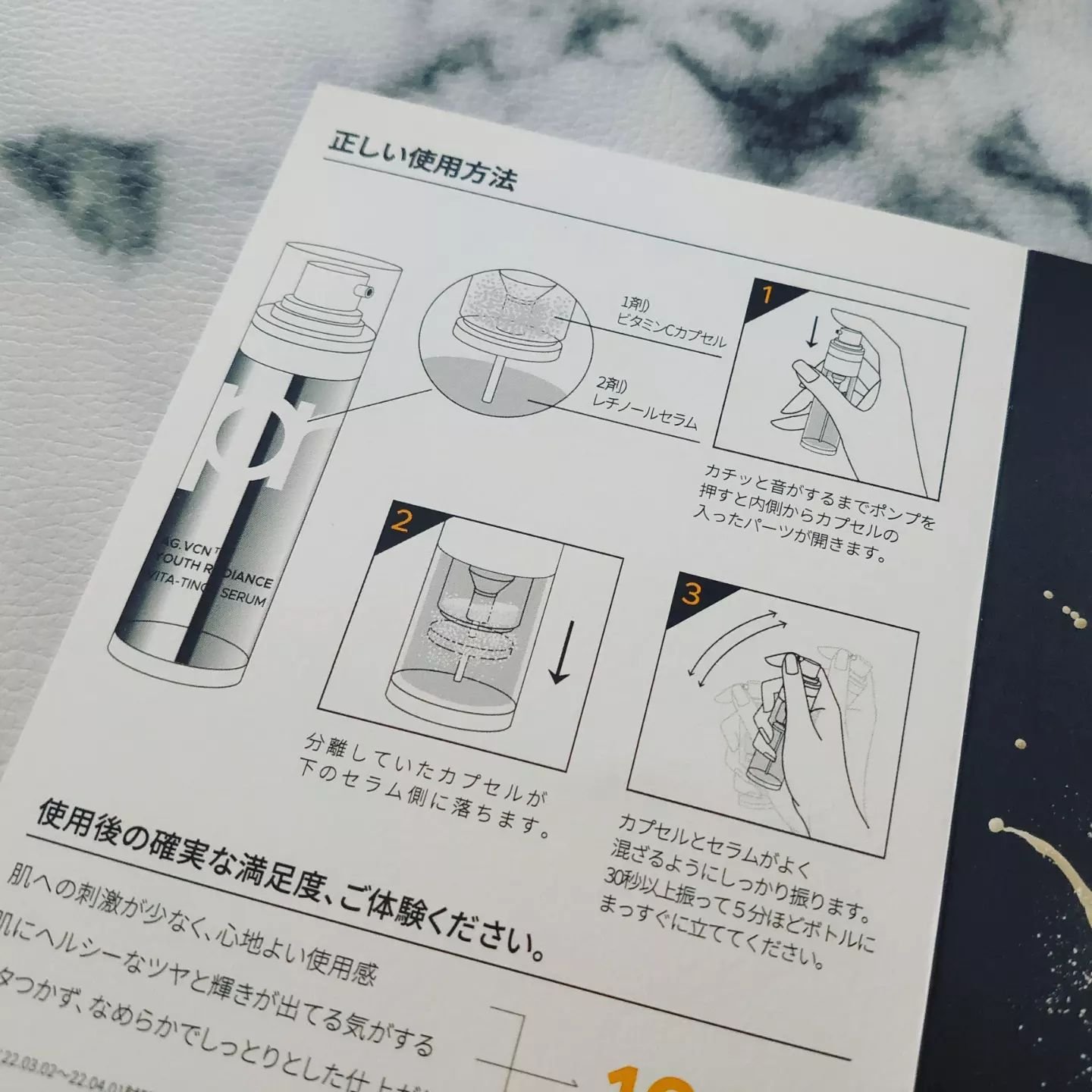 シルバーのボトルは、とってもオシャレ カプセルパートとセラムパートで分かれているのでふたを開け、カチッと音がするまでポンプを押し、最初に使用するときは、カプセルが溶けてセラムとよく混ざるように30秒以上、上下に振り、5分ほど立てておき、お肌になじませます。 ビタミンC+レチノールを実現したセラムはビタミンCカプセルとピュアレチノールの革新的な組み合わせで、毛穴や弾力などの肌の状態をケアし、健康的で美しい肌へと導くことができます。 やっぱり、別々に使ってたビタミンCとレチノールが一緒に使えるのはうれしい!
