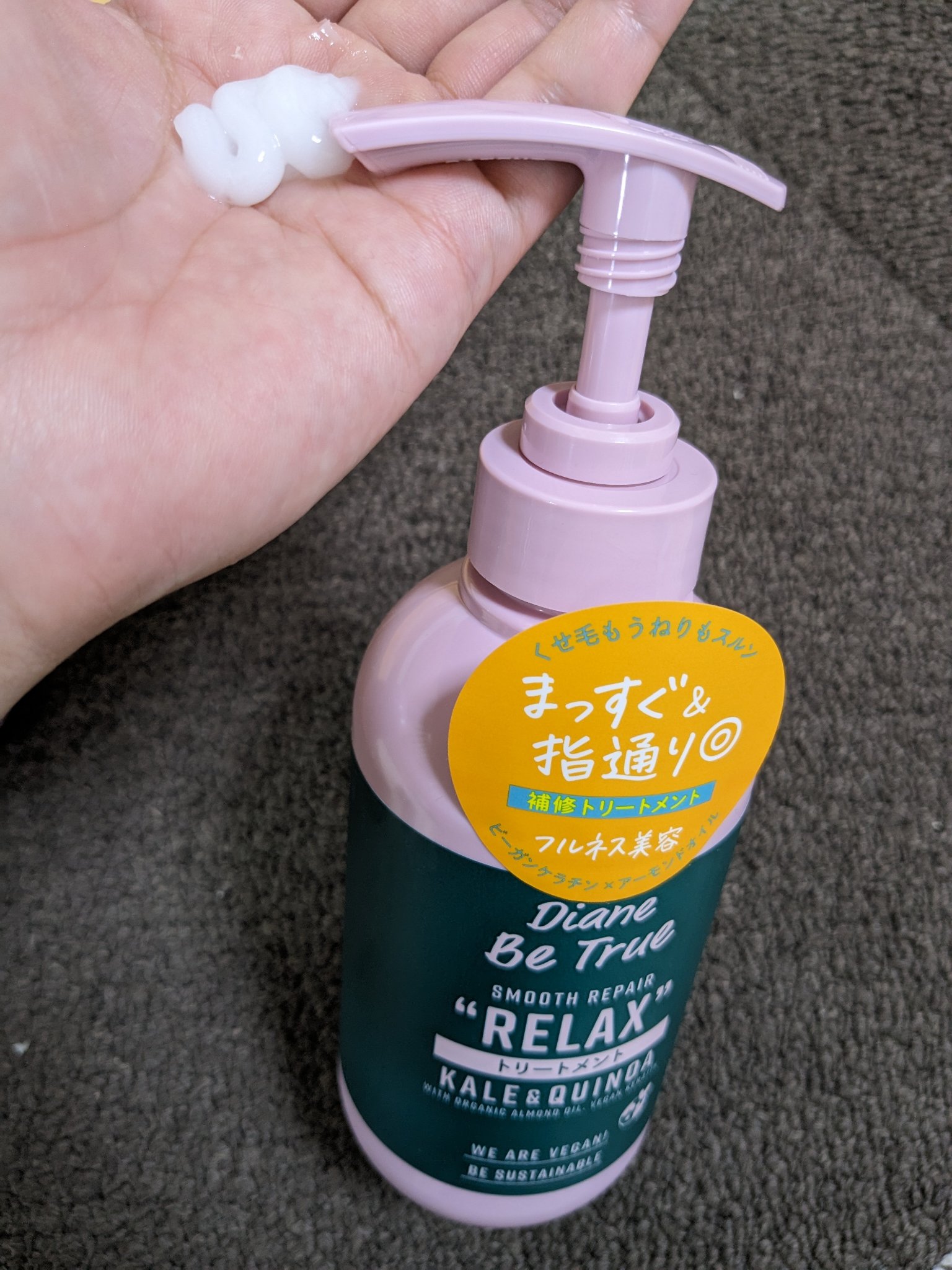 - ビーガンケラチン(*1)とオーガニックアーモンドオイル(*2)配合。 キヌア(*3)や植物性プロテイン(*4)のうるおいが毛先までしっかり浸透し、くせ毛やうねり髪をするんとまっすぐなめらかに仕上げます。 リラックスベジ―の香り(グレープフルーツ/セロリ/ムスク):太陽の恵みをたっぷり浴びたジューシーなフルーツと、フレッシュなグリーンベジタブルが調和し、すがすがしい気分に。