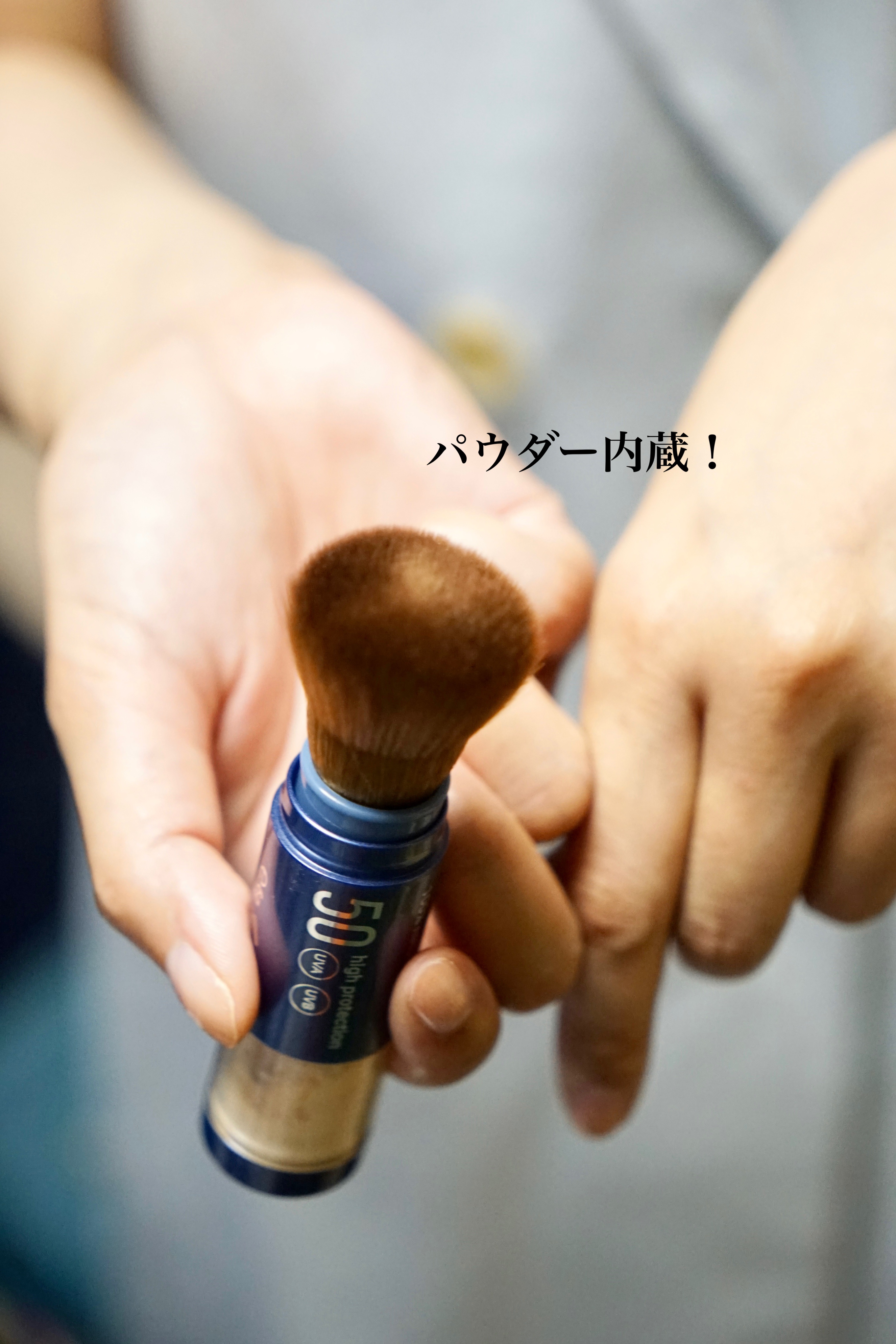 コンパクトで持ち歩きに便利な紫外線対策パウダー☺️ パウダーをブラシで塗るだけで手軽に紫外線ブロック&テカリ対策ができちゃうスティックタイプの新しいコスメです。 厳選したオーガニック素材を使用していて、オイリー肌や敏感肌の方でも使えます。 パウダーは思ったより、ナチュラルに色づく感じでした。マットな仕上がり、と紹介にはありましたが濃くなりすぎず私には合っていました❤️ ブラシもフサフサで優しい使い心地〜! また、ウォータープルーフなので汗ばむ今の時期にも大活躍してくれています。