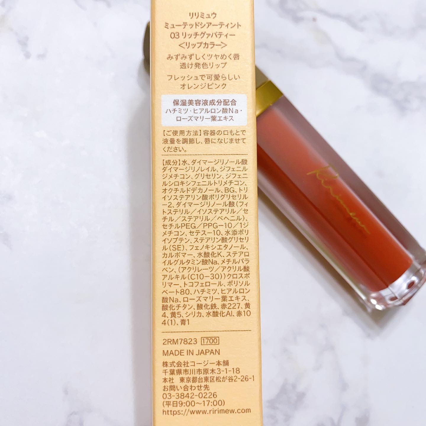 - <01 パピーレッド> 水、ダイマージリノール酸ダイマージリノレイル、ジフェニルジメチコン、ジフェニルシロキシフェニルトリメチコン、オクチルドデカノール、トリイソステアリン酸ポリグリセリルー2、ラウロイルグルタミン酸ジ(フィトステリル/オクチルドデシル)、ダイマージリノール酸(フィトステリル/イソステアリル/セチル/ステアリル/ベヘニル)、BG、水添ポリイソブテン、グリセリン、セテスー10、エタノール、セチルPEG/PPGー10/1ジメチコン、(アクリル酸ヒドロキシエチル/アクリロイルジメチルタウリンNa)コポリマー、イソヘキサデカン、フェノキシエタノール、メチルパラベン、ポリソルベート60、トコフェロール、エチルパラベン、デヒドロ酢酸Na、リン酸2Na、リン酸Na、シメチコン、シリカ、ハチミツ、スクワラン、ステアリン酸ソルビタン、ステアリン酸グリセリル、オレイン酸ポリグリセリルー10、セルロースガム、ヒアルロン酸Na、ローズマリー葉エキス、(+/ー)酸化鉄、酸化チタン、赤227、黄4、赤226、ポリアスパラギン酸Na、PVP、アクリレーツコポリマーアンモニウム、キサンタンガム、水酸化Al、EDTAー2Na <02 ピンクフォンデュ> 水、ダイマージリノール酸ダイマージリノレイル、ジフェニルジメチコン、ジフェニルシロキシフェニルトリメチコン、オクチルドデカノール、トリイソステアリン酸ポリグリセリルー2、ラウロイルグルタミン酸ジ(フィトステリル/オクチルドデシル)、ダイマージリノール酸(フィトステリル/イソステアリル/セチル/ステアリル/ベヘニル)、BG、水添ポリイソブテン、グリセリン、セテスー10、エタノール、セチルPEG/PPGー10/1ジメチコン、(アクリル酸ヒドロキシエチル/アクリロイルジメチルタウリンNa)コポリマー、イソヘキサデカン、フェノキシエタノール、メチルパラベン、ポリソルベート60、トコフェロール、エチルパラベン、デヒドロ酢酸Na、リン酸2Na、リン酸Na、シメチコン、シリカ、ハチミツ、スクワラン、ステアリン酸ソルビタン、ステアリン酸グリセリル、オレイン酸ポリグリセリルー10、セルロースガム、ヒアルロン酸Na、ローズマリー葉エキス、(+/ー)酸化鉄、酸化チタン、赤227、黄4、赤226、ポリアスパラギン酸Na、PVP、アクリレーツコポリマーアンモニウム、キサンタンガム、水酸化Al、EDTAー2Na <03 リッチグァバティー> 水、ダイマージリノール酸ダイマージリノレイル、ジフェニルジメチコン、グリセリン、ジフェニルシロキシフェニルトリメチコン、オクチルドデカノール、BG、トリイソステアリン酸ポリグリセリル-2、ダイマージリノール酸(フィトステリル/イソステアリル/セチル/ステアリル/ベヘニル)、セチルPEG/PPG-10/1ジメチコン、セテス-10、水添ポリイソブテン、ステアリン酸グリセリル(SE)、フェノキシエタノール、カルボマー、水酸化K、ステアロイルグルタミン酸Na、メチルパラベン、(アクリレーツ/アクリル酸アルキル(C10-30))クロスポリマー、トコフェロール、ポリソルベート80、ハチミツ、ヒアルロン酸Na、ローズマリー葉エキス、酸化チタン、酸化鉄、赤227、黄4、黄5、シリカ、水酸化Al、赤104(1)、青1 <04 オレンジアールグレイ> 水、ダイマージリノール酸ダイマージリノレイル、ジフェニルジメチコン、グリセリン、ジフェニルシロキシフェニルトリメチコン、オクチルドデカノール、BG、トリイソステアリン酸ポリグリセリル-2、ダイマージリノール酸(フィトステリル/イソステアリル/セチル/ステアリル/ベヘニル)、セチルPEG/PPG-10/1ジメチコン、セテス-10、水添ポリイソブテン、ステアリン酸グリセリル(SE)、フェノキシエタノール、カルボマー、水酸化K、ステアロイルグルタミン酸Na、メチルパラベン、(アクリレーツ/アクリル酸アルキル(C10-30))クロスポリマー、トコフェロール、ハチミツ、ヒアルロン酸Na、ローズマリー葉エキス、酸化鉄、黄4、赤227、黄5、シリカ <05 コンポートピンク> 水、ジフェニルジメチコン、ダイマージリノール酸ダイマージリノレイル、グリセリン、ジフェニルシロキシフェニルトリメチコン、オクチルドデカノール、BG、トリイソステアリン酸ポリグリセリル-2、ダイマージリノール酸(フィトステリル/イソステアリル/セチル/ステアリル/ベヘニル)、水添ポリイソブテン、セテス-10、セチルPEG/PPG-10/1ジメチコン、ステアリン酸グリセリル(SE)、フェノキシエタノール、カルボマー、水酸化K、ステアロイルグルタミン酸Na、(アクリレーツ/アクリル酸アルキル(C10-30))クロスポリマー、メチルパラベン、トコフェロール、ポリソルベート80、ハチミツ、ヒアルロン酸Na、ローズマリー葉エキス、(+/-)酸化チタン、酸化鉄、赤227、赤104(1)、黄4、黄5、シリカ、水酸化Al、青1 <06 ピンクマーガレット> 水、ジフェニルジメチコン、ダイマージリノール酸ダイマージリノレイル、グリセリン、ジフェニルシロキシフェニルトリメチコン、オクチルドデカノール、BG、トリイソステアリン酸ポリグリセリル-2、ダイマージリノール酸(フィトステリル/イソス