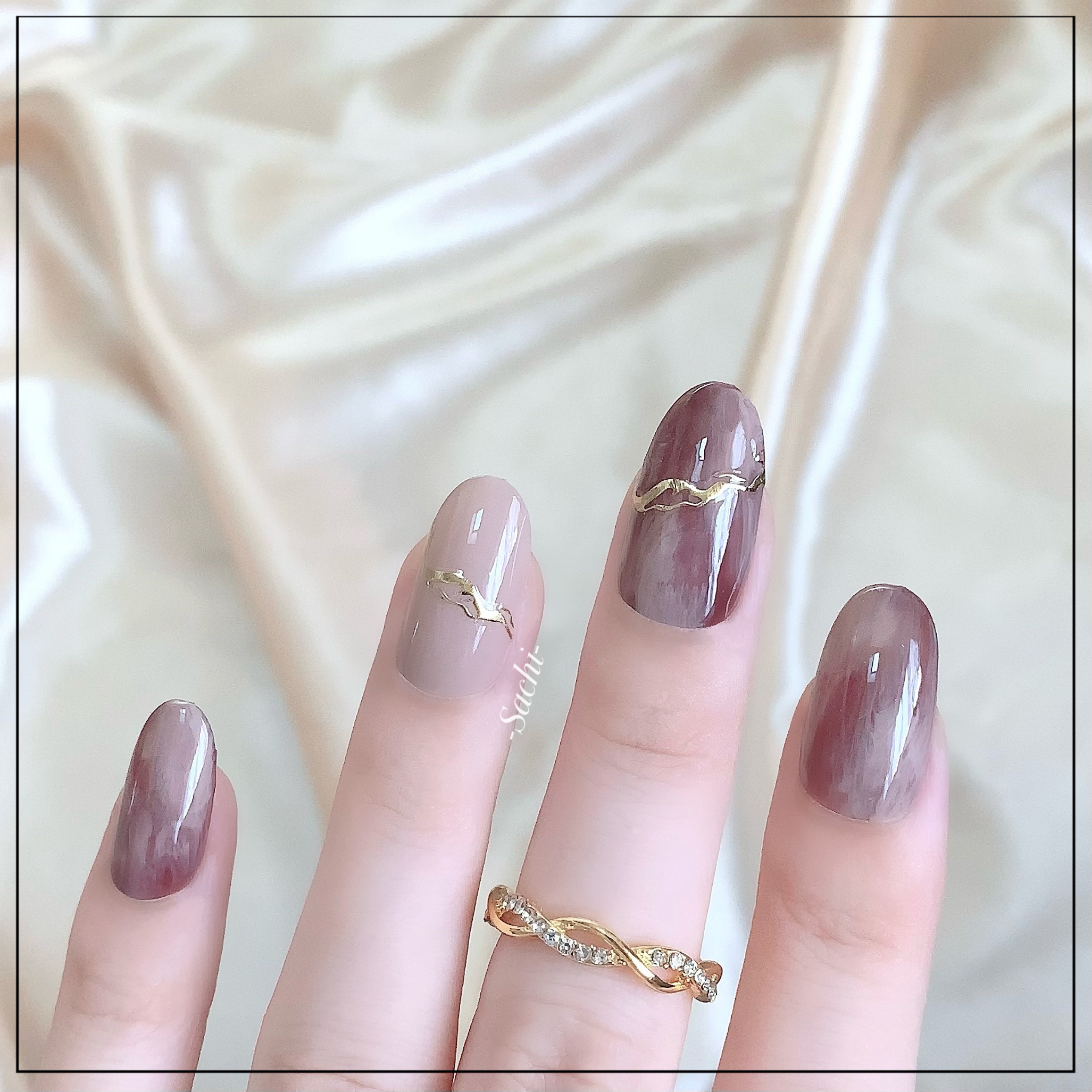 ワンカラーでも指ごとに色を変えるだけでオシャレに見えます💕 画像のようにゴールドラインとストーンを少し足すだけで華やかさがアップ🥰 何度かご紹介したことのあるスポンジで作るグラデーションです✨ スポンジを使うことで境目が綺麗に馴染んでくれます💕 アルミホイルの上でブラウンとトップコートを1:1くらいで混ぜたものを、トップコートのハケに取って3箇所に塗るだけ👌 事前に混ぜたものを塗ることで、爪の上でぼかすより簡単に出来ます💕 ベースカラーが乾く前に点置きしてぼかすことで綺麗にぼかせます✨ スピードが大事なので、使うポリッシュのキャップは全て開けておきましょう😊 天然石のラインはガタガタの方がより天然石っぽく見えるので、ラインを描くのが苦手な方でも大丈夫🙆♀️ 難しそうに見えて、やってみると意外と簡単に出来ます♡