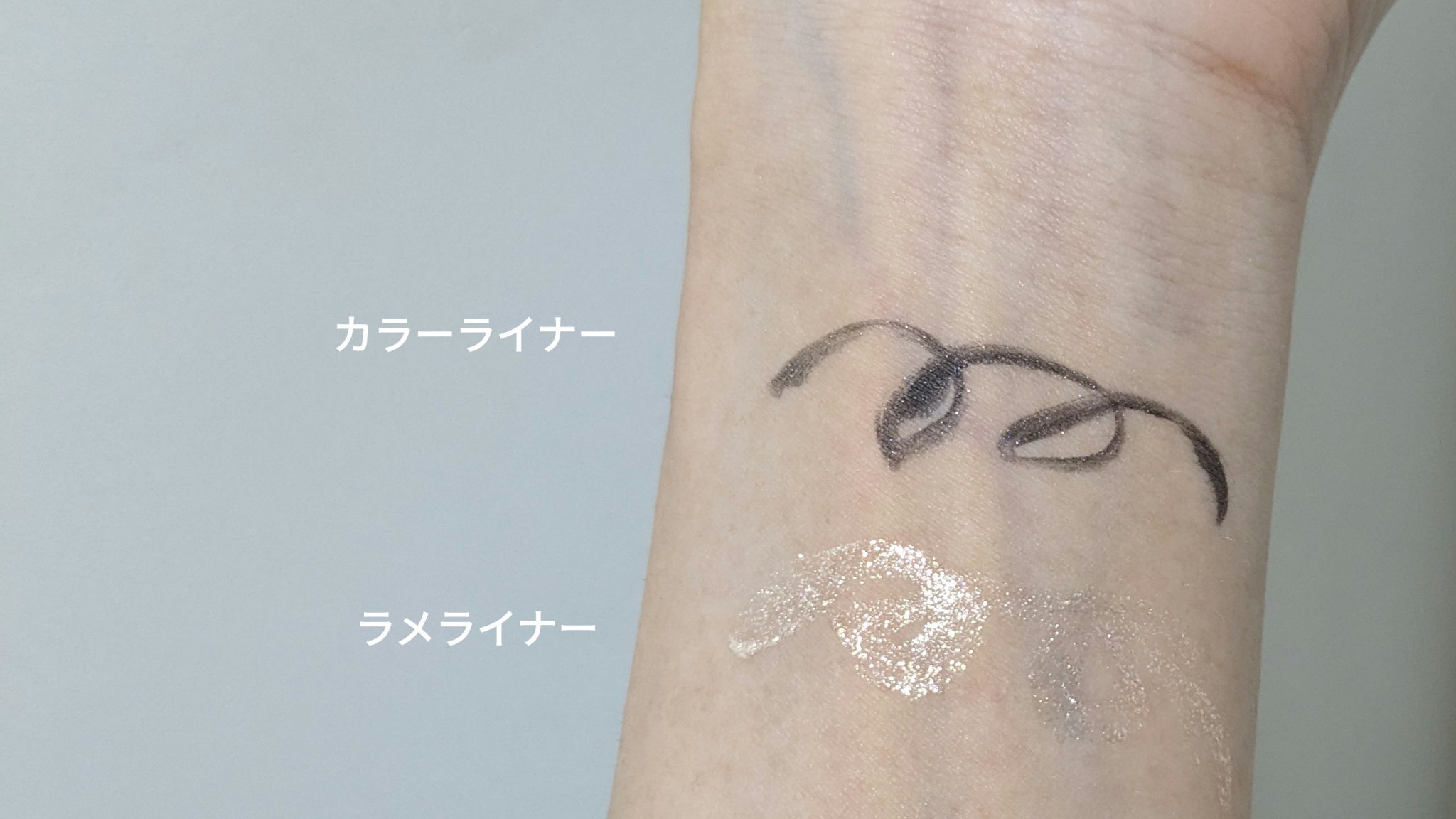細かいラメが引けるライナーになります。細めの筆でのせやすいのもお気に入りポイント。 グリッターほどやりすぎ感がなく、何も塗っていない時より自然な存在感が出るので、 美容液成分が配合されているようです。確かに一日中つけていても乾燥は感じにくかったです。