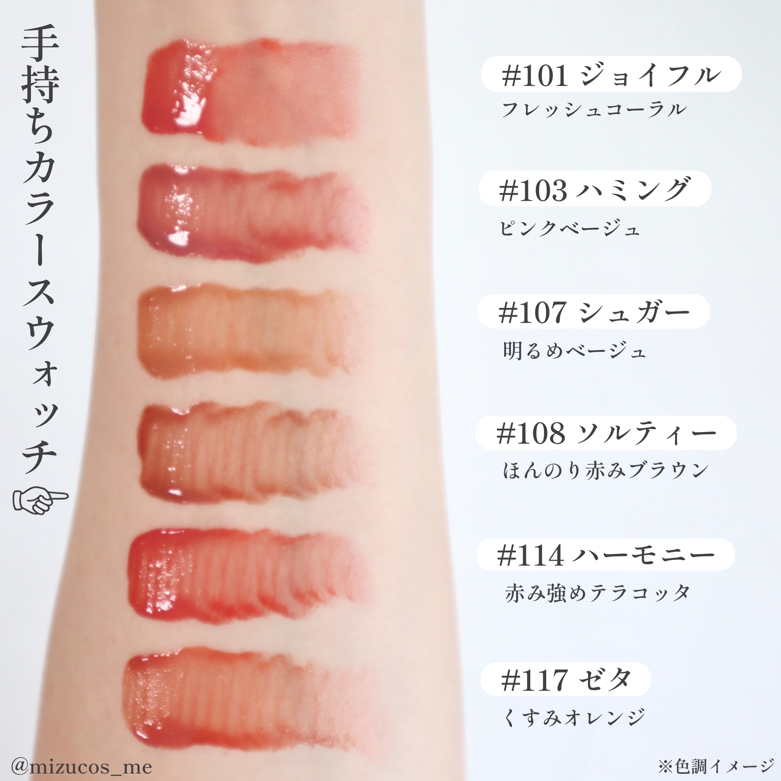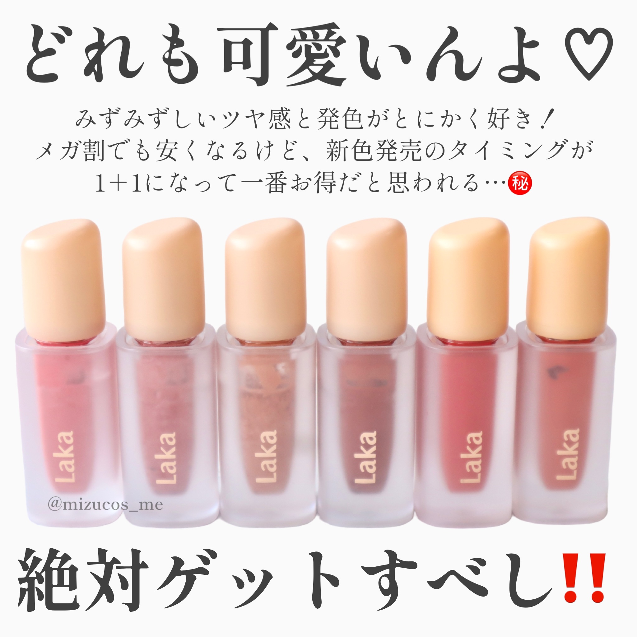結論、なんでバズってないのか 私には理解できないくらいに良い🙆♀️ まず見た目が大優勝ね🏅 飴ちゃんみたいに透き通った色が めちゃくちゃ綺麗じゃない?? ずっと見てられる✨✨ もちろんリップとしての性能も優秀🏆 個人的にめっちゃ好きな ヒンスのムードインハンサーウォーターリキッドグロウ のむちっとした質感と LaKaのフルーティーグラムティントの 透け艶な感じを合わせた感じ!! 色もどれも可愛くて、私はイエベなので 青みが少ない色を選んだけど 全部で8色あるよ!!! 一番お気に入りは 002 サマーアプリコット🍑 まじで可愛い色だから使ってみて欲しい!!