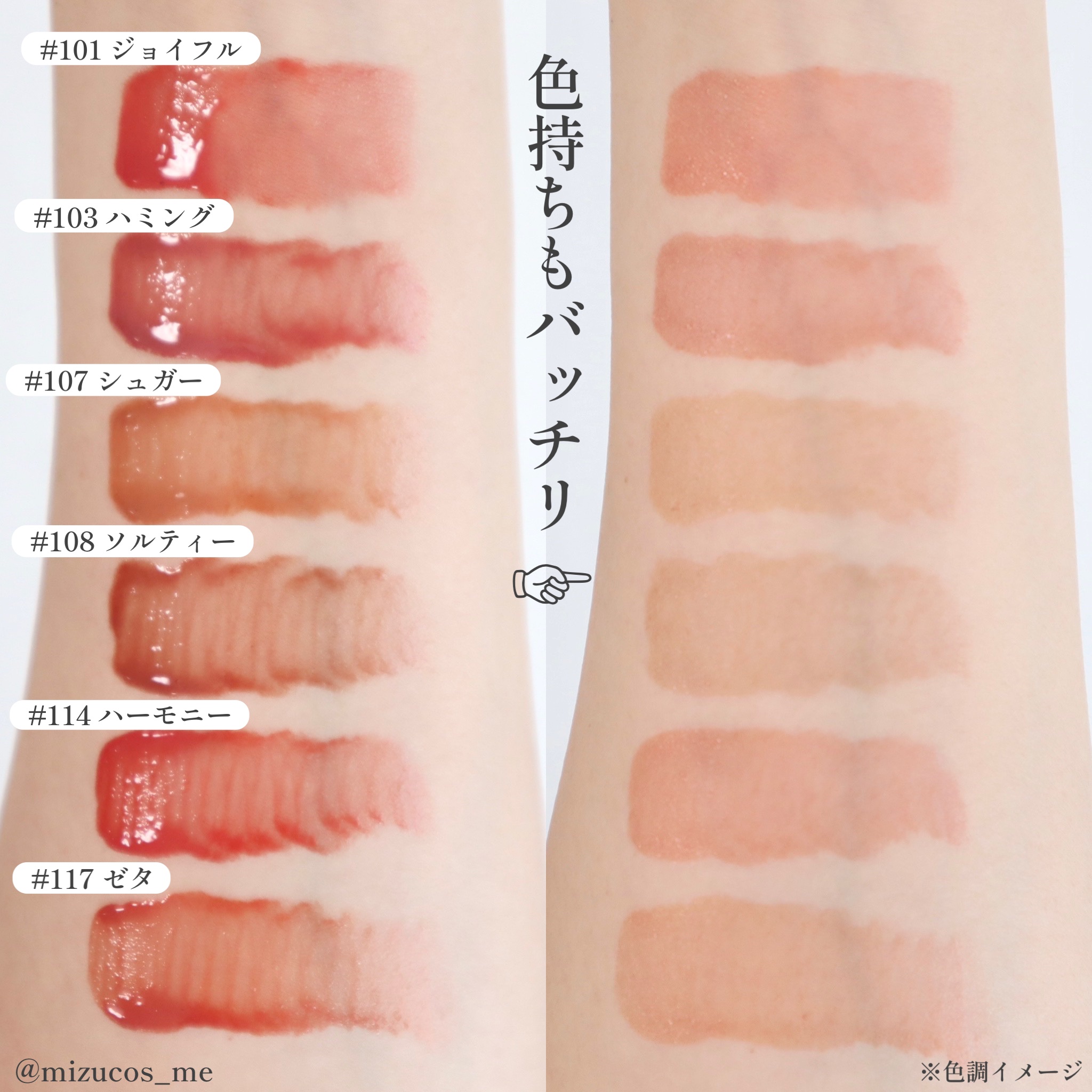 - <101 ジョイフル> 水、リンゴ酸ジイソステアリル、ダイマージリノール酸(フィトステリル/イソステアリル/セチル/ステアリル/ベヘニル)、ジイソステアリン酸ダイマージリノレイル、ノナイソステアリン酸ポリグリセリル-10、オクチルドデカノール、ビスジグリセリルポリアシルアジペート-2、水添ポリイソブテン、セチルPEG/PPG-10/1ジメチコン、ポリソルベート60(小麦由来)、イソステアリン酸ソルビタン(小麦由来)、1,2-ヘキサンジオール、グリセリン、ベヘニルアルコール、(アクリル酸/MA)コポリマーNa、ペンチレングリコール、BG、ポリアクリレート-13、トロメタミン、(アクリレーツ/アクリル酸アルキ ル(C10-30 )クロスポリマー、エチルヘキシルグリセリン、ポリイソブテン、(アクリル酸ヒドロキシエチル/アクリロイルジメチルタウリンNa)コポリマー、スクワラン、デヒドロ酢酸、ステビオシド、香料、フィチン酸、カプリリルグリコール、ジメチコン、水添ロジン酸メチル、水酸化Al、ポリソルベート20(小麦由来)、トコフェロール、ライム果汁、キイチゴ果汁、レモン果汁、マンゴー果汁、フラガリアチロエンシス果汁、アンズ果汁、オレンジ果汁、グレープフルーツ液汁、キウイ果汁、パパイア果汁、[+/-]酸化チタン、黄4、黄5、赤 104(1)、赤227、青1 <102 デューイ> 水、リンゴ酸ジイソステアリル、ダイマージリノール酸(フィトステリル/イソステアリル/セチル/ステアリル/ベヘニル)、ジイソステアリン酸ダイマージリノレイル、ノナイソステアリン酸ポリグリセリル-10、オクチルドデカノール、ビスジグリセリルポリアシルアジペート-2、水添ポリイソブテン、セチルPEG/PPG-10/1ジメチコン、ポリソルベート60(小麦由来)、イソステアリン酸ソルビタン(小麦由来)、1,2-ヘキサンジオール、グリセリン、ベヘニルアルコール、(アクリル酸/MA)コポリマーNa、ペンチレングリコール、BG、ポリアクリレート-13、トロメタミン、(アクリレーツ/アクリル酸アルキル(C10-30))クロスポリマー、エチルヘキシルグリセリン、ポリイソブテン、(アクリル酸ヒドロキシエチル/アクリロイルジメチルタウリンNa)コポリマー、スクワラン、デヒドロ酢酸、ステビオシド、香料、フィチン酸、ジメチコン、水添ロジン酸メチル、水酸化Al、カプリリルグリコール、ポリソルベート20(小麦由来)、トコフェロール、ライム果汁、キイチゴ果汁、レモン果汁、マンゴー果汁、フラガリアチロエンシス果汁、アンズ果汁、オレンジ果汁、グレープフルーツ液汁、キウイ果汁、パパイア果汁、酸化チタン、赤227、黄5、黄4、青1 <103 ハミング> 水、リンゴ酸ジイソステアリル、ダイマージリノール酸(フィトステリル/イソステアリル/セチル/ステアリル/ベヘニル)、ジイソステアリン酸ダイマージリノレイル、ノナイソステアリン酸ポリグリセリル-10、オクチルドデカノール、ビスジグリセリルポリアシルアジペート-2、水添ポリイソブテン、セチルPEG/PPG-10/1ジメチコン、ポリソルベート60(小麦由来)、イソステアリン酸ソルビタン(小麦由来)、1,2-ヘキサンジオール、グリセリン、ベヘニルアルコール、(アクリル酸/MA)コポリマーNa、ペンチレングリコール、BG、ポリアクリレート-13、トロメタミン、(アクリレーツ/アクリル酸アルキル(C10-30))クロスポリマー、エチルヘキシルグリセリン、ポリイソブテン、(アクリル酸ヒドロキシエチル/アクリロイルジメチルタウリンNa)コポリマー、スクワラン、デヒドロ酢酸、ステビオシド、香料、フィチン酸、ジメチコン、水添ロジン酸メチル、水酸化Al、カプリリルグリコール、ポリソルベート20(小麦由来)、トコフェロール、ライム果汁、キイチゴ果汁、レモン果汁、マンゴー果汁、フラガリアチロエンシス果汁、アンズ果汁、オレンジ果汁、グレープフルーツ液汁、キウイ果汁、パパイア果汁、酸化チタン、黄5、赤227、青1 <104 チェリー> 水、リンゴ酸ジイソステアリル、ダイマージリノール酸(フィトステリル/イソステアリル/セチル/ステアリル/ベヘニル)、ジイソステアリン酸ダイマージリノレイル、ノナイソステアリン酸ポリグリセリル-10、オクチルドデカノール、ビスジグリセリルポリアシルアジペート-2、水添ポリイソブテン、セチルPEG/PPG- 10/1ジメチコン、イソステアリン酸ソルビタン(小麦由来)、ポリソルベート60(小麦由来)、1,2-ヘキサンジオール、グリセリン、ベヘニルアルコール、(アクリル酸/MA)コポリマーNa、ペンチレングリコール、BG、ポリアクリレート-13、ト ロメタミン、(アクリレーツ/アクリル酸ア ルキル(C10-30))クロスポリマー、エチルヘキシルグリセリン、ポリイソブテ ン、(アクリル酸ヒドロキシエチル/アクリ ロイルジメチルタウリンNa)コポリマー、スクワラン、デヒドロ酢酸、ステビオシド、香料、カプリリルグリコール、ポリソルベー ト20(小麦由来)、トコフェロール、ライム果汁、キイチゴ果汁、レモン果汁、マンゴー 果汁、フラガリアチロエンシス果汁、アンズ 果汁、オレンジ果汁、グレープフルーツ液 汁、キウ