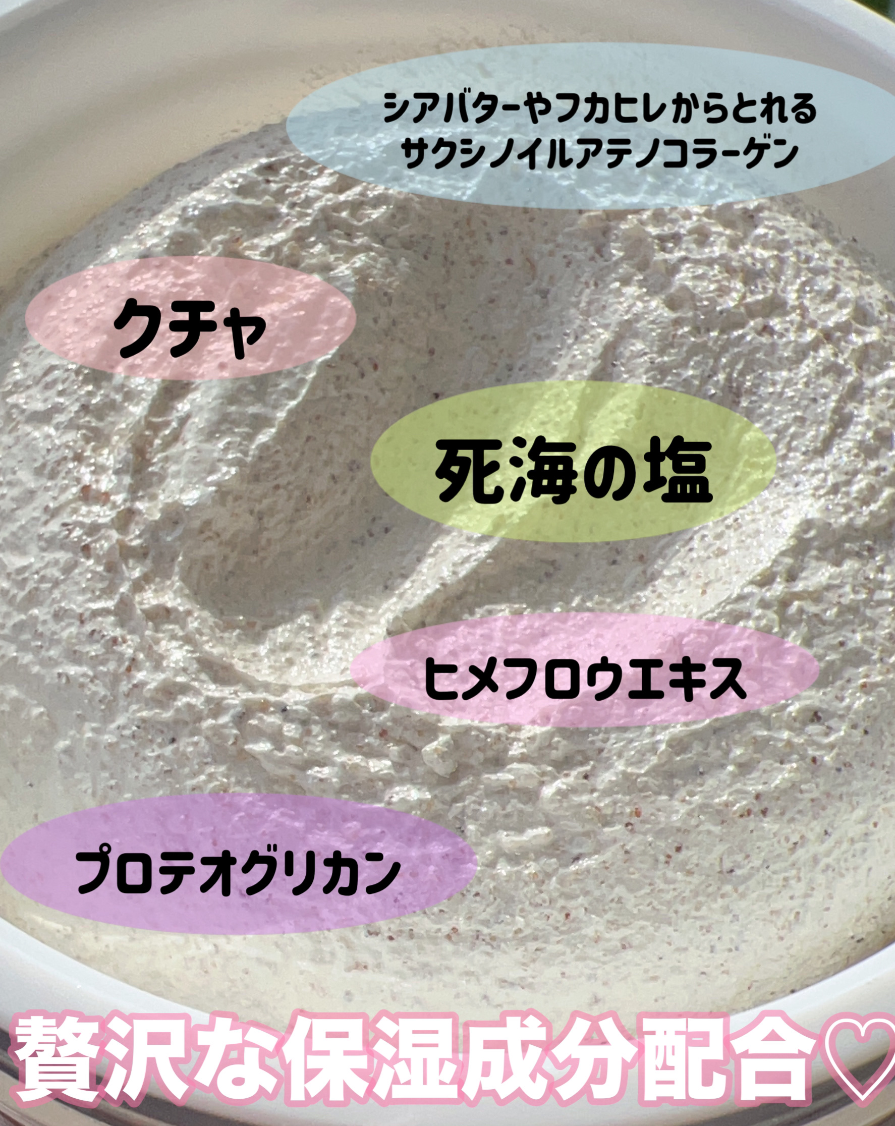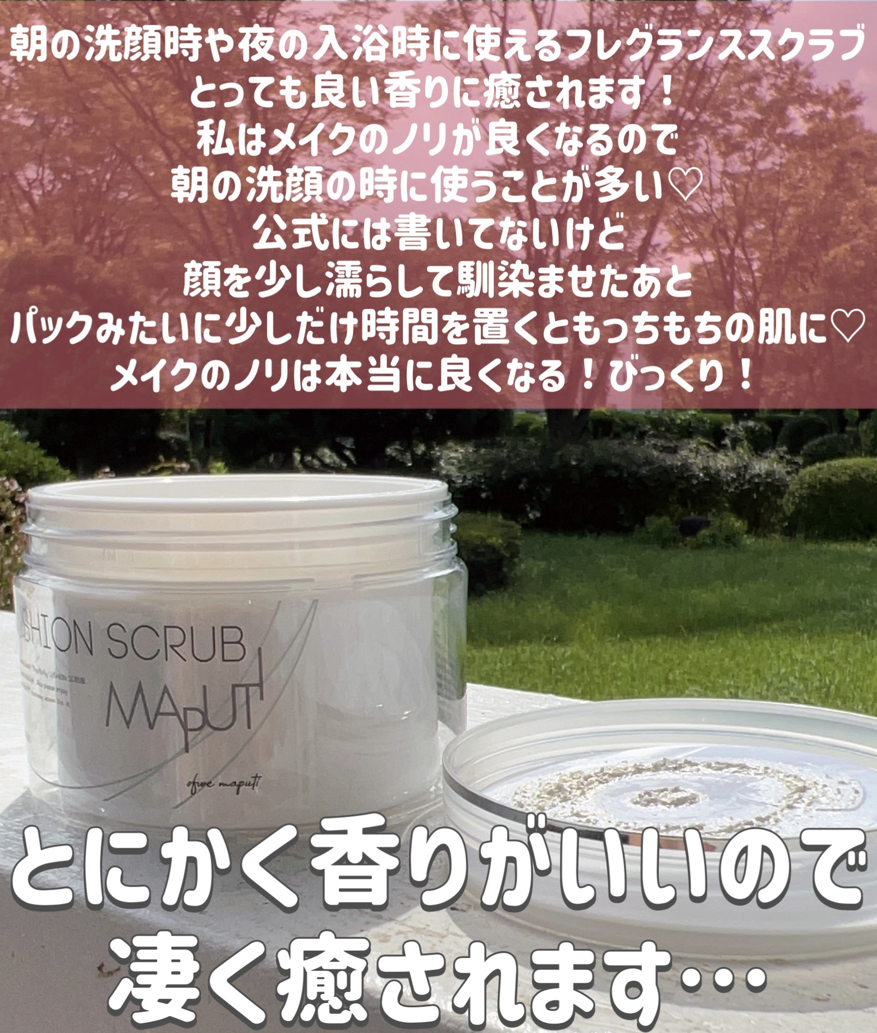 - ふわっふわの顔にも使えるクッションスクラブ!クリームを塗るようにやさしくスクラビングでき、ざらつきの気になる肌や乾燥肌でお悩みの方をもっちりスベスベ肌にしてくれるスクラブです。ふわっふわスクラブなので、目に入りにくく顔に使用することも可能。化粧ノリも良くなります!オーガニック成分・天然由来成分をメインに含有しており、シアバターやフカヒレから採れるサクシノイルアテロコラーゲン、死海の塩、クチャ、プロテオグリカン、ヒメフロウエキスなど、贅沢な保湿成分で構成されています。お風呂で一度使えば、長時間MAPUTIの良い香りがお肌からふわっと香ります。