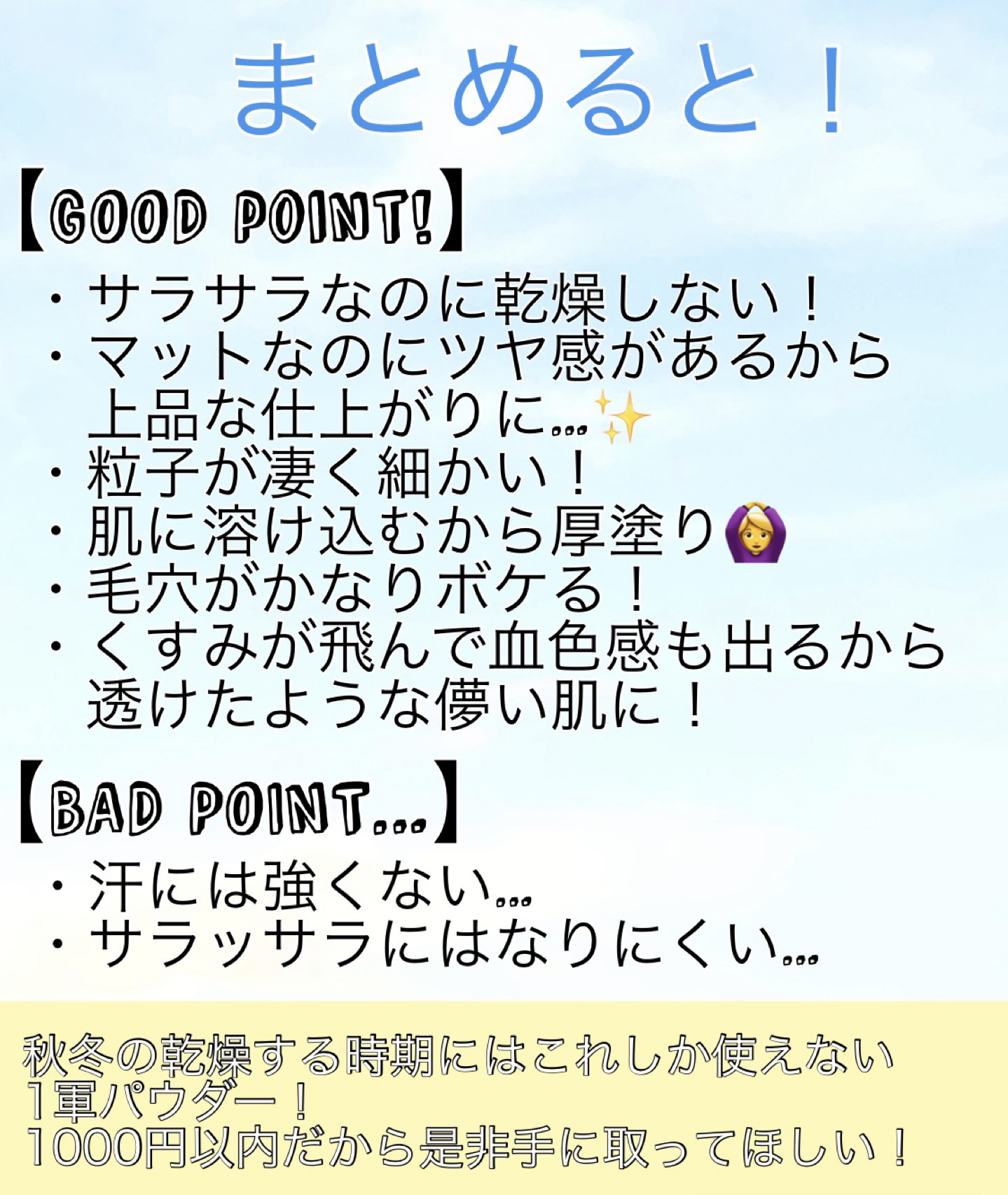 | フェイスパウダーランキング第19位 | 顔がテカりやすく毛穴が気になる方にはぴったりです!片栗粉のようにサラッサラで、粒子がかなり細かいです✨ | 詳細を見る | |