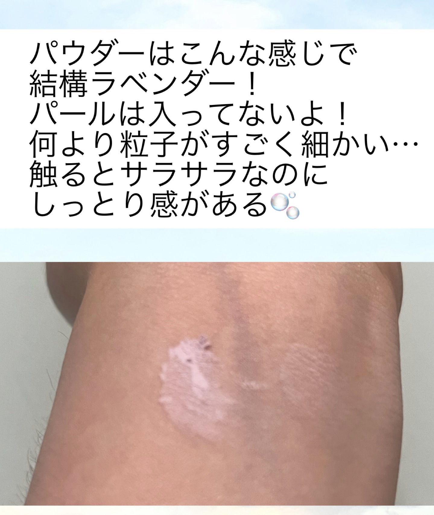 仕上がりはとってもスキ♥ ヴェールをかけたようなサラッとしたパウダー ラベンダーだからトーンアップもしてくれて個人的には毛穴もある程度カバーしてくれます!! 短時間のお出かけや日焼け止め+パウダーのみの楽ちんメイクの時には大活躍のパウダーかなと。