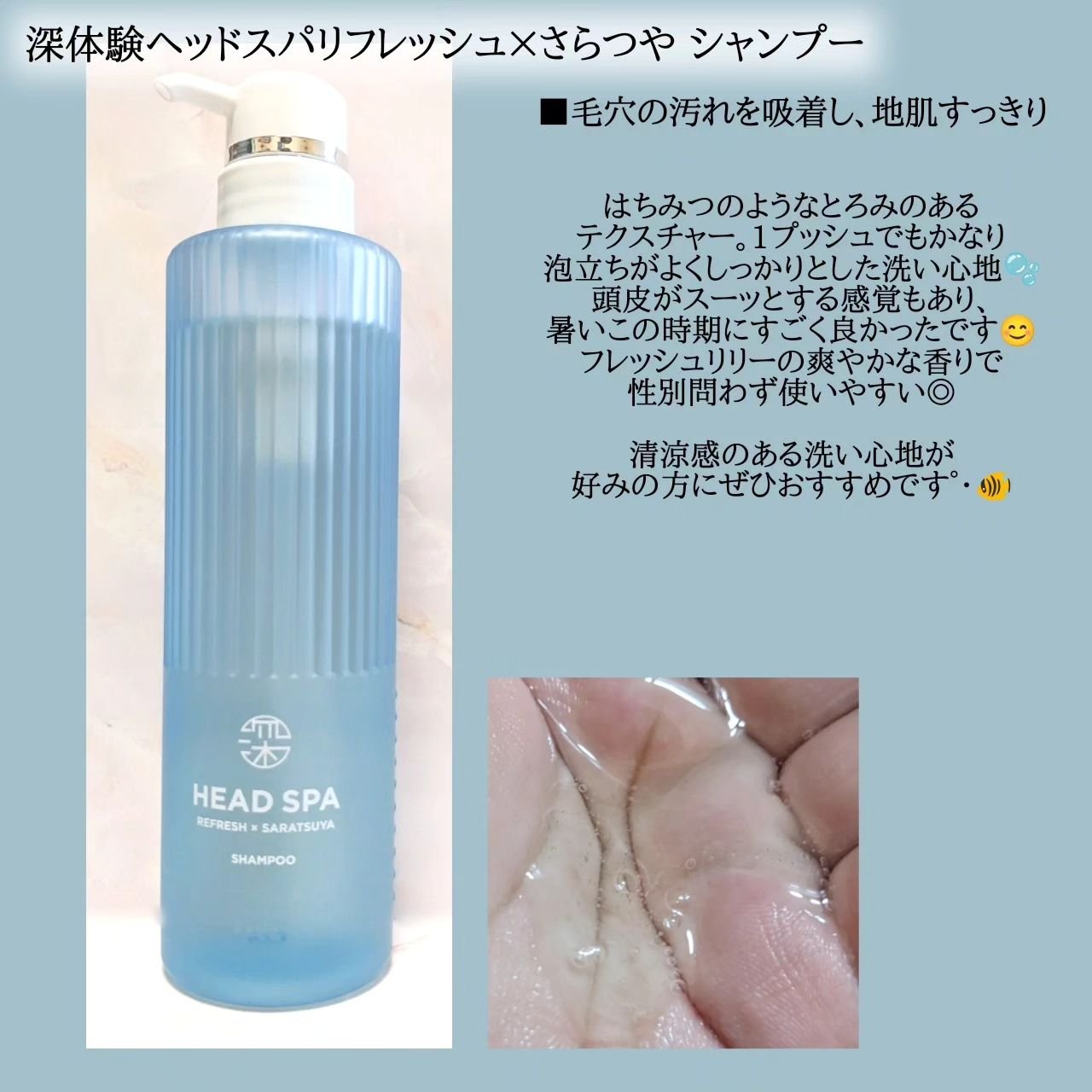 ヘッドスパ帰りのような仕上がりを提供するプレミアムなh&sのシリーズ。 スパリセット処方が地肌と髪のすみずみまで浸透し、毛穴の奥の皮脂や汚れをすっきりやさしく洗い流してくれるそう。 爽やかな水色のボトルが可愛い🩵 シャンプーはびよーんととろみのあるテクスチャー。