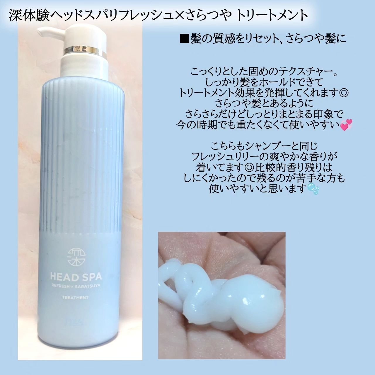 - [シャンプーのみ医薬部外品] 深体験ヘッドスパで、地肌ケア&ヘアケア。シャンプーは、スパリセット処方の濃密泡で細かな地肌汚れまで吸着。 毛穴の奥からやさしく洗い流します。リフレッシュ感のある泡でマッサージをすることで、地肌をリフレッシュ。 トリートメントは高濃度リッチスパ処方が髪の内側まで深く浸透。髪の内側からうるおいで満たし、ダメージから髪を保護します。 髪1本1本を包み込み、毛先までさらっとつやのある髪へ。リフレッシュリリーの香り。 2023 年 6 月 24日(土)より一部のバラエティストアにて先行限定発売を開始。 2023 年 9 月より全国で発売を開始