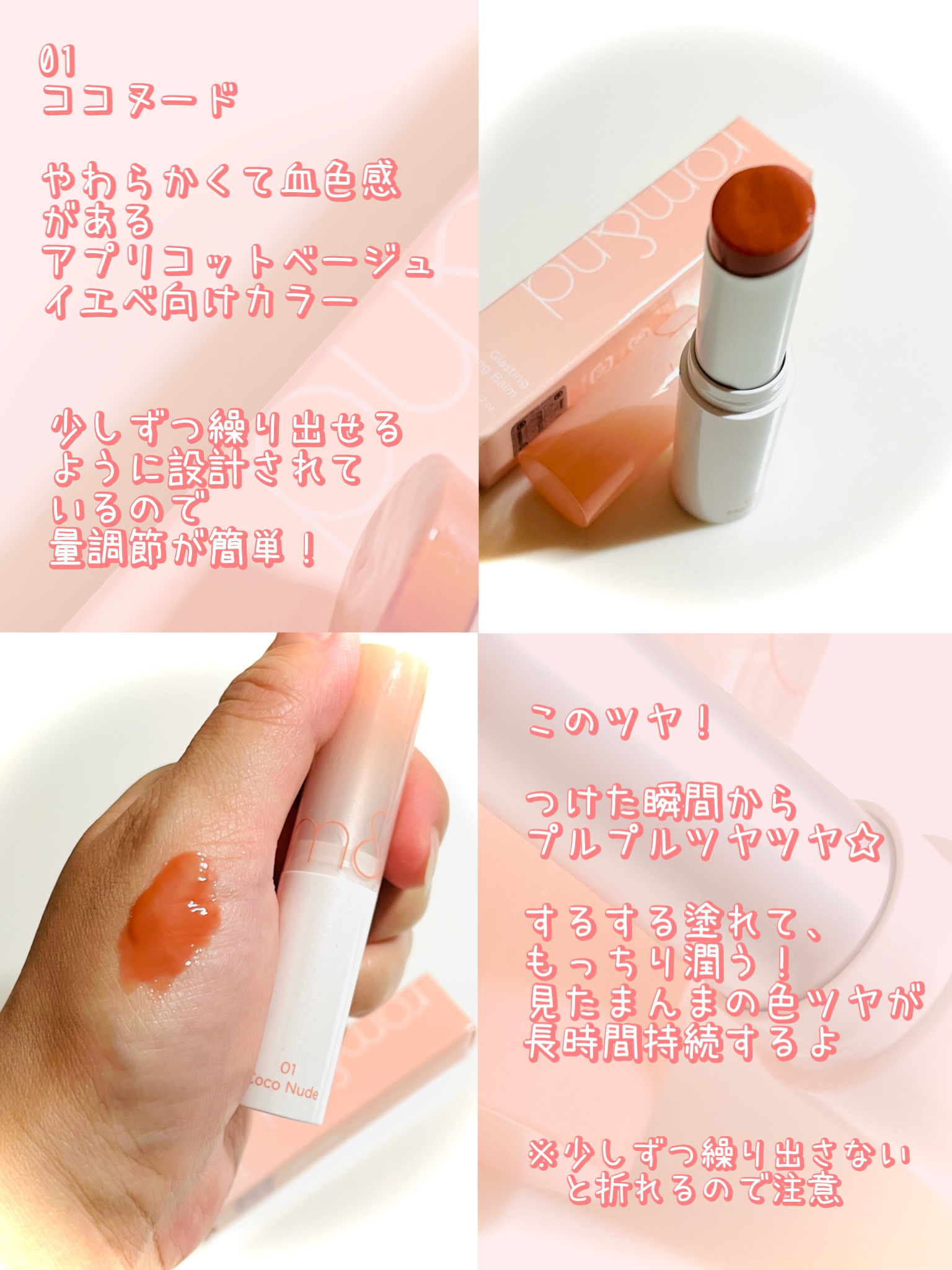 ボリュームのある💋が簡単にできちゃうよ! 実は、初めてグラスティングメルティングバームを買ったんだよね𖤐´- 01 / ココヌード💋 粘膜リップみたいな印象があってとっても可愛いお色味。アプリコットベージュだよ♡ 1度塗り、2度塗りで表情が違うから楽しいリップケアもできちゃうよ!