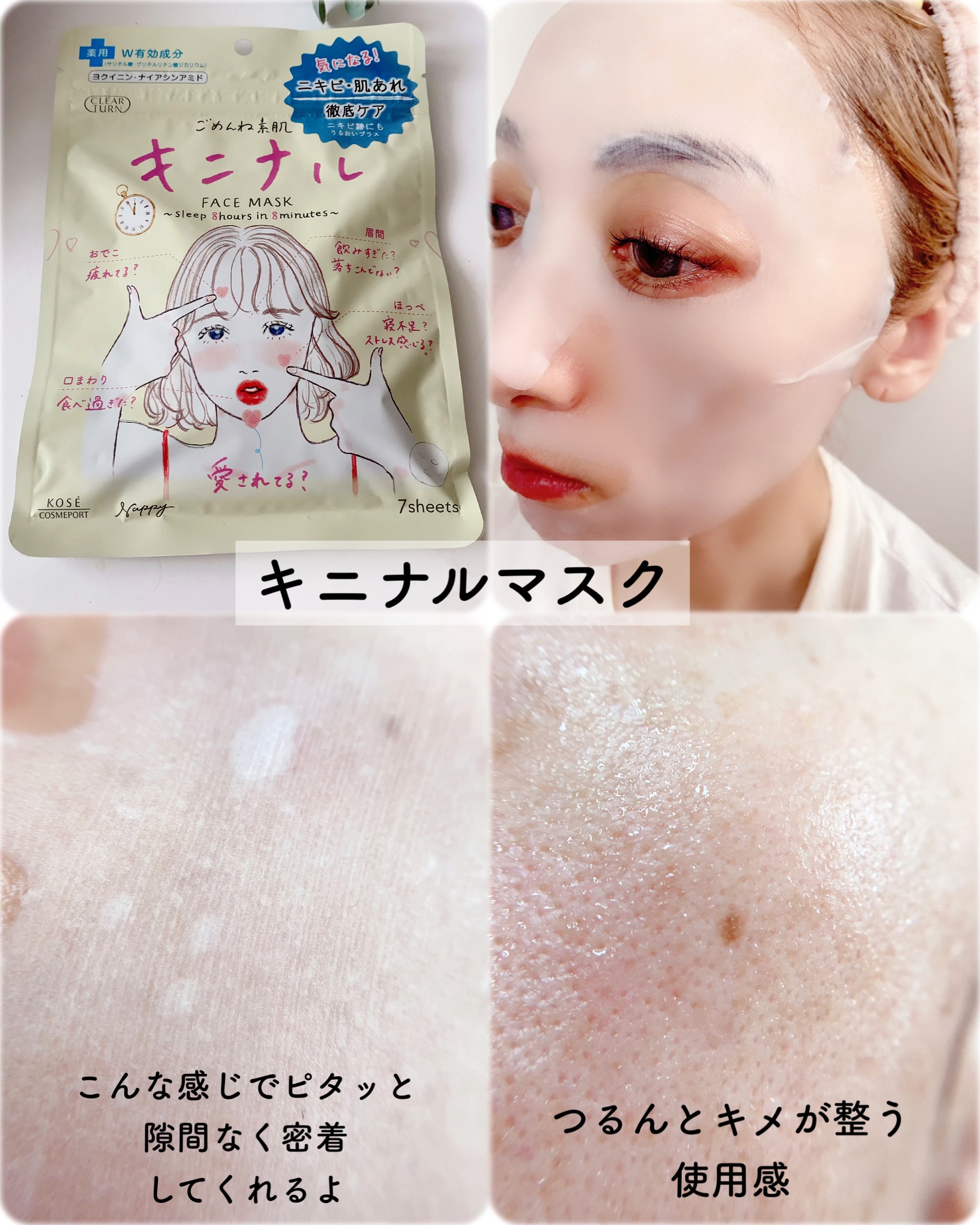 全部使い切ったけど、正直に言うと、うーん…って感じ この金額ならもっといいマスクあるよね…? 使用感大事な私は、このパックの素材がそもそも合わなくて、パックつけた時の気持ちい〜って感じが無いのが残念 唯一キニナルマスクは着け心地割とすきだったんだけど、これをつけてる時だけ何故かTゾーンがめちゃくちゃ乾燥して 鎮静に特化してる分、保湿はイマイチだったのかな、と感じました 絵とか可愛くて買った時はテンション上がるけどリピはないかなあ…