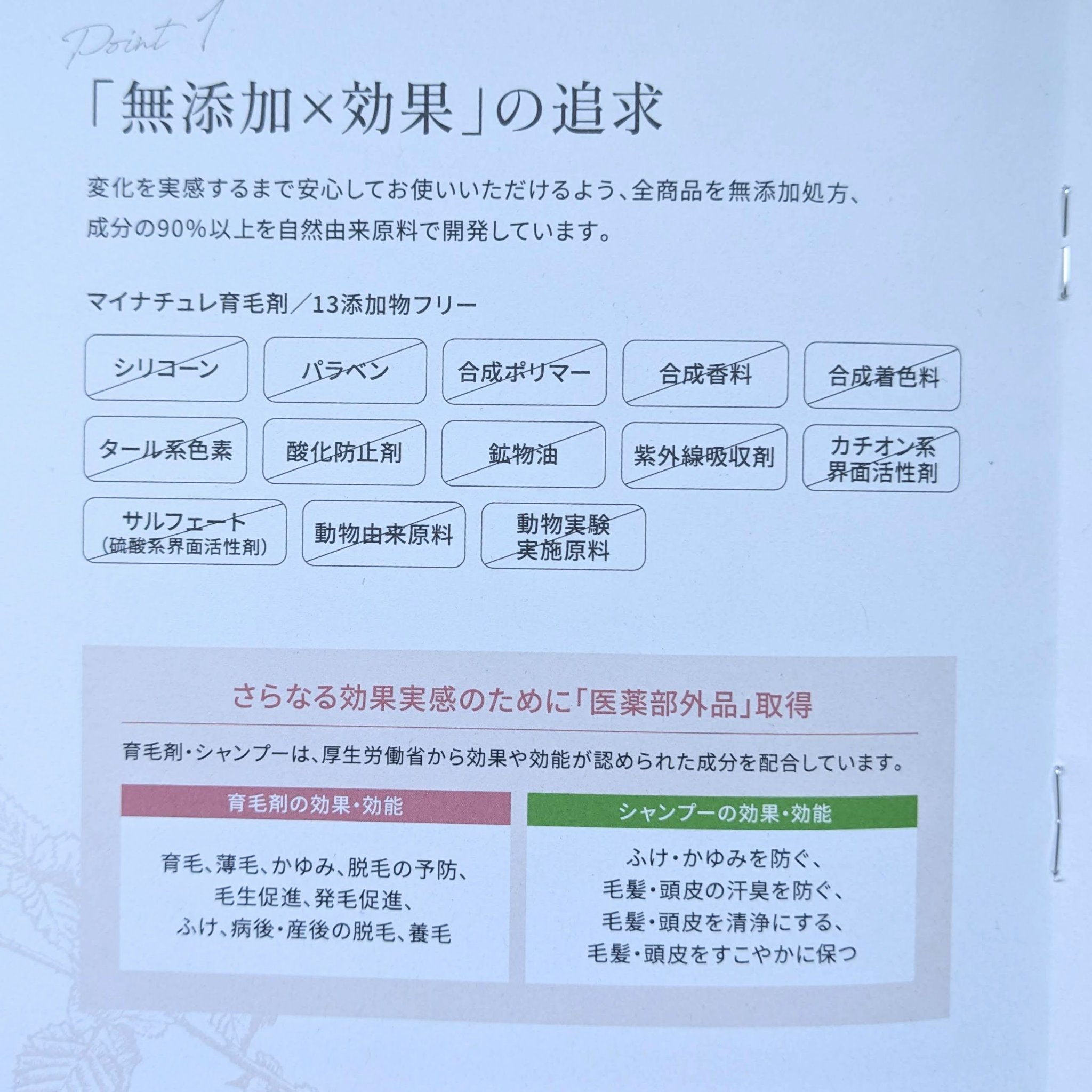 - 【医薬部外品】 ①抜け毛・薄毛を防ぎ、発毛を促進する6種の有効成分 より育毛効果を期待できるよう6種の成分を配合。女性の育毛、薄毛・抜け毛予防、病後・老後の抜け毛に効果が期待できます。 ②浸透サポート「ナノカプセル化発酵植物エキス」 コメ発酵液、豆乳発酵液、ハトムギ発酵液をナノカプセル化させたトリプル発酵植物エキスはマイナチュレオリジナルの配合成分。頭皮に素早く浸透し、ケア成分を頭皮の角質層まで届けます。 ③育毛のための地肌スキンケア成分4種を配合 化粧品にも使用されるスキンケア成分*を配合。たっぷりと使用いただくことで頭皮がうるおい、乾燥などの外的ダメージから守ります。 *加水分解ヒアルロン酸、ユズセラミド、マヨラナエキス、キョウニンエキス ④使いやすいスプレー容器「まっすぐ浸透スプレー」を採用 液だれがしにくく、頭皮にしっかり届く「まっすぐ浸透スプレー」を採用。指で軽くプッシュするだけで塗布できるので、毎日のお手入れも手軽にできます。ボトル部分を半透明にしたことで、残量もわかりやすくなりました。