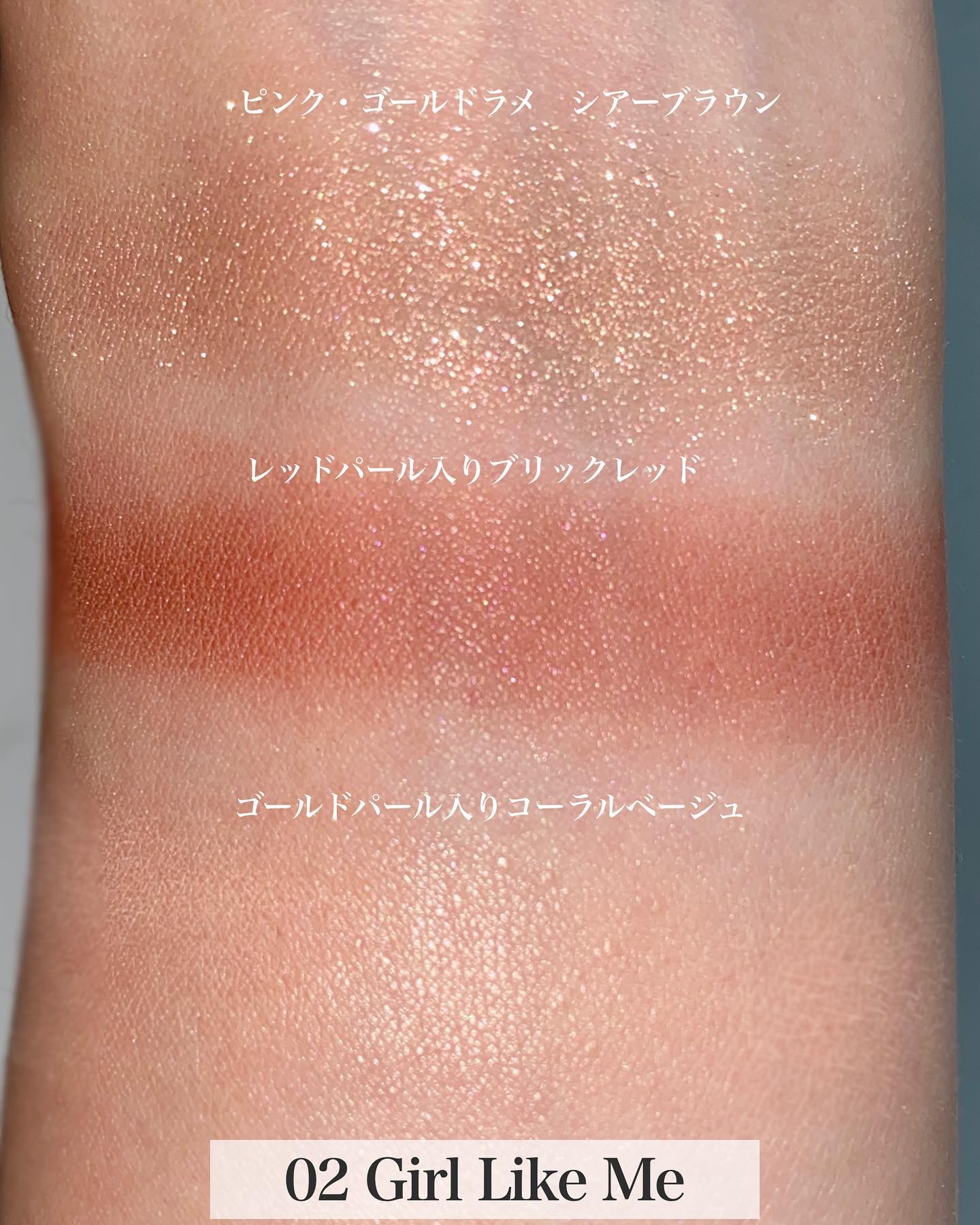 - ・01 Trench Beige 左上:トリ(カプリル酸/カプリン酸)グリセリル、タルク、ダイマージリノール酸ジ(イソステアリル/フィトステリル)、シリカ、ダイマージリノール酸ダイマージリノレイルビス(ベヘニル/イソステアリル/フィトステリル)、カルナウバロウ、アルガニアスピノサ核油、オリーブ果実油、ホホバ種子油、ザクロ花エキス、ジイソステアリン酸ポリグリセリル-3、ヒアルロン酸Na、トコフェロール、ホウケイ酸(Ca/Al)、マイカ、酸化チタン、酸化鉄、酸化スズ 左上以外:タルク、ラウロイルリシン、シリカ、スクワラン、トリ(カプリル酸/カプリン酸)グリセリル、ダイマージリノール酸ジ(イソステアリル/フィトステリル)、イソステアリン酸水添ヒマシ油、アルガニアスピノサ核油、オリーブ果実油、ホホバ種子油、ザクロ花エキス、ジイソステアリン酸ポリグリセリル-3、ヒアルロン酸Na、ジステアリン酸Al、セタノール、トコフェロール、マイカ、酸化鉄、ホウケイ酸(Ca/Al)、酸化チタン、グンジョウ、水酸化Al、酸化スズ ・02 Girl Like Me 左上:トリ(カプリル酸/カプリン酸)グリセリル、タルク、ダイマージリノール酸ジ(イソステアリル/フィトステリル)、シリカ、ダイマージリノール酸ダイマージリノレイルビス(ベヘニル/イソステアリル/フィトステリル)、カルナウバロウ、アルガニアスピノサ核油、オリーブ果実油、ホホバ種子油、ザクロ花エキス、ジイソステアリン酸ポリグリセリル-3、ヒアルロン酸Na、トコフェロール、マイカ、ホウケイ酸(Ca/Al)、酸化チタン、酸化鉄、酸化スズ 右上:タルク、シリカ、ラウロイルリシン、スクワラン、トリ(カプリル酸/カプリン酸)グリセリル、ダイマージリノール酸ジ(イソステアリル/フィトステリル)、イソステアリン酸水添ヒマシ油、アルガニアスピノサ核油、オリーブ果実油、ホホバ種子油、ザクロ花エキス、ジイソステアリン酸ポリグリセリル-3、ヒアルロン酸Na、ジステアリン酸Al、セタノール、トコフェロール、マイカ、酸化鉄、酸化チタン、赤226、グンジョウ、酸化スズ 下段:タルク、ラウロイルリシン、シリカ、スクワラン、トリ(カプリル酸/カプリン酸)グリセリル、ダイマージリノール酸ジ(イソステアリル/フィトステリル)、イソステアリン酸水添ヒマシ油、アルガニアスピノサ核油、オリーブ果実油、ホホバ種子油、ザクロ花エキス、ジイソステアリン酸ポリグリセリル-3、ヒアルロン酸Na、ジステアリン酸Al、セタノール、トコフェロール、水酸化Al、マイカ、酸化チタン、酸化鉄、黄4、赤226、グンジョウ ・03 Lilac Dress 左上:トリ(カプリル酸/カプリン酸)グリセリル、タルク、ダイマージリノール酸ジ(イソステアリル/フィトステリル)、シリカ、ダイマージリノール酸ダイマージリノレイルビス(ベヘニル/イソステアリル/フィトステリル)、カルナウバロウ、アルガニアスピノサ核油、オリーブ果実油、ホホバ種子油、ザクロ花エキス、ジイソステアリン酸ポリグリセリル-3、ヒアルロン酸Na、トコフェロール、マイカ、ホウケイ酸(Ca/Al)、酸化チタン、酸化鉄、グンジョウ、赤226、酸化スズ 右上:タルク、ラウロイルリシン、シリカ、スクワラン、トリ(カプリル酸/カプリン酸)グリセリル、ダイマージリノール酸ジ(イソステアリル/フィトステリル)、イソステアリン酸水添ヒマシ油、ジステアリン酸Al、アルガニアスピノサ核油、オリーブ果実油、ホホバ種子油、ザクロ花エキス、ジイソステアリン酸ポリグリセリル-3、ヒアルロン酸Na、セタノール、トコフェロール、マイカ、酸化チタン、グンジョウ、酸化鉄、赤226、酸化スズ 下段:タルク、トリ(カプリル酸/カプリン酸)グリセリル、ダイマージリノレイル水添ロジン縮合物、スクワラン、ダイマージリノール酸ジ(イソステアリル/フィトステリル)、アルガニアスピノサ核油、オリーブ果実油、シリカ、ホホバ種子油、ザクロ花エキス、ジイソステアリン酸ポリグリセリル-3、ヒアルロン酸Na、ジステアリン酸Al、トコフェロール、マイカ、酸化鉄、ホウケイ酸(Ca/Al)、酸化チタン、グンジョウ、酸化スズ ・04 Urban Khaki 左上:トリ(カプリル酸/カプリン酸)グリセリル、タルク、ダイマージリノール酸ジ(イソステアリル/フィトステリル)、シリカ、ダイマージリノール酸ダイマージリノレイルビス(ベヘニル/イソステアリル/フィトステリル)、カルナウバロウ、アルガニアスピノサ核油、オリーブ果実油、ホホバ種子油、ザクロ花エキス、ジイソステアリン酸ポリグリセリル-3、ヒアルロン酸Na、トコフェロール、マイカ、ホウケイ酸(Ca/Al)、酸化チタン、酸化鉄、グンジョウ、酸化スズ 左上以外:タルク、ラウロイルリシン、シリカ、スクワラン、トリ(カプリル酸/カプリン酸)グリセリル、ダイマージリノール酸ジ(イソステアリル/フィトステリル)、イソステアリン酸水添ヒマシ油、アルガニアスピノサ核油、オリーブ果実油、ホホバ種子油、ザクロ花エキス、ジイソステアリン酸ポリグリセリル-3、ヒアルロン酸Na、ジステアリン酸Al、セタノー