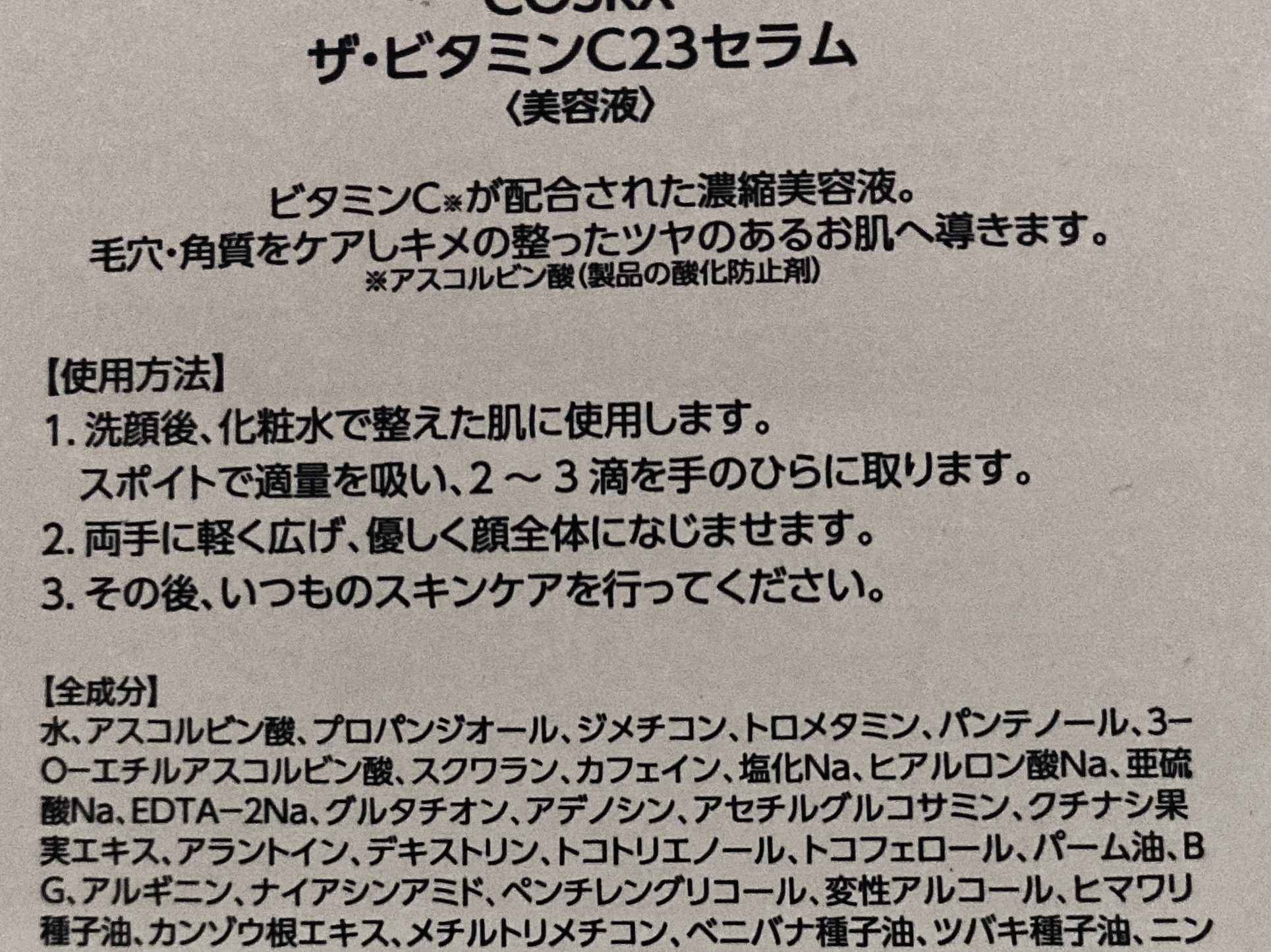 - <20g> 水、ペンチレングリコール、ジメチコン、スクワラン、トコフェロール、ヤシ油、アルギニン、プロパンジオール、ツバキ種子油、カンゾウ根エキス、デキストリン、ニンジン根エキス、パンテノール、アラントイン、カフェイン、ヒマワリ種子油、ナイアシンアミド、ヒアルロン酸ナトリウム、変性アルコール、アセチルグルコサミン、トロメタミン、アデノシン、塩化ナトリウム、トコトリエノール、メチルトリメチコン、ブチレングリコール、グルタチオン、EDTA二ナトリウム、エチルアスコルビルエーテル、アスコルビン酸(23%)、亜硫酸ナトリウム、クチナシフロリダ果実エキス、カルタマスティンクトリウス( ベニバナ種子油、ベータカロチン