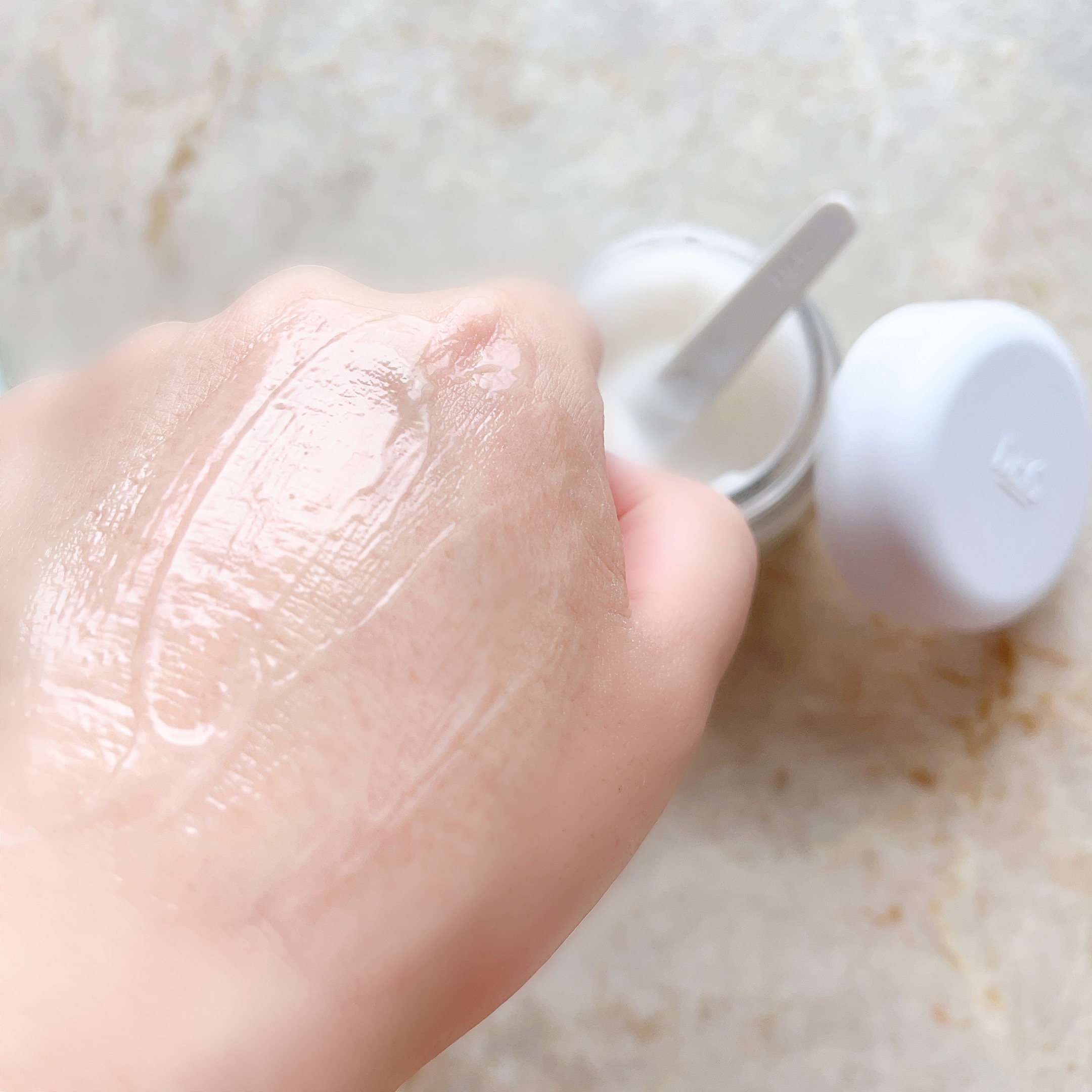 週に1・2回で濡れた手のまま使用できる 低刺激ピーリング 優しくクルクルするだけでポロポロとでてきます その後ぬるま湯で優しく洗い流すだけでお肌にツルツル 顔だけでなく首やデコルテなどにも使えて 一度でツルスベ肌に