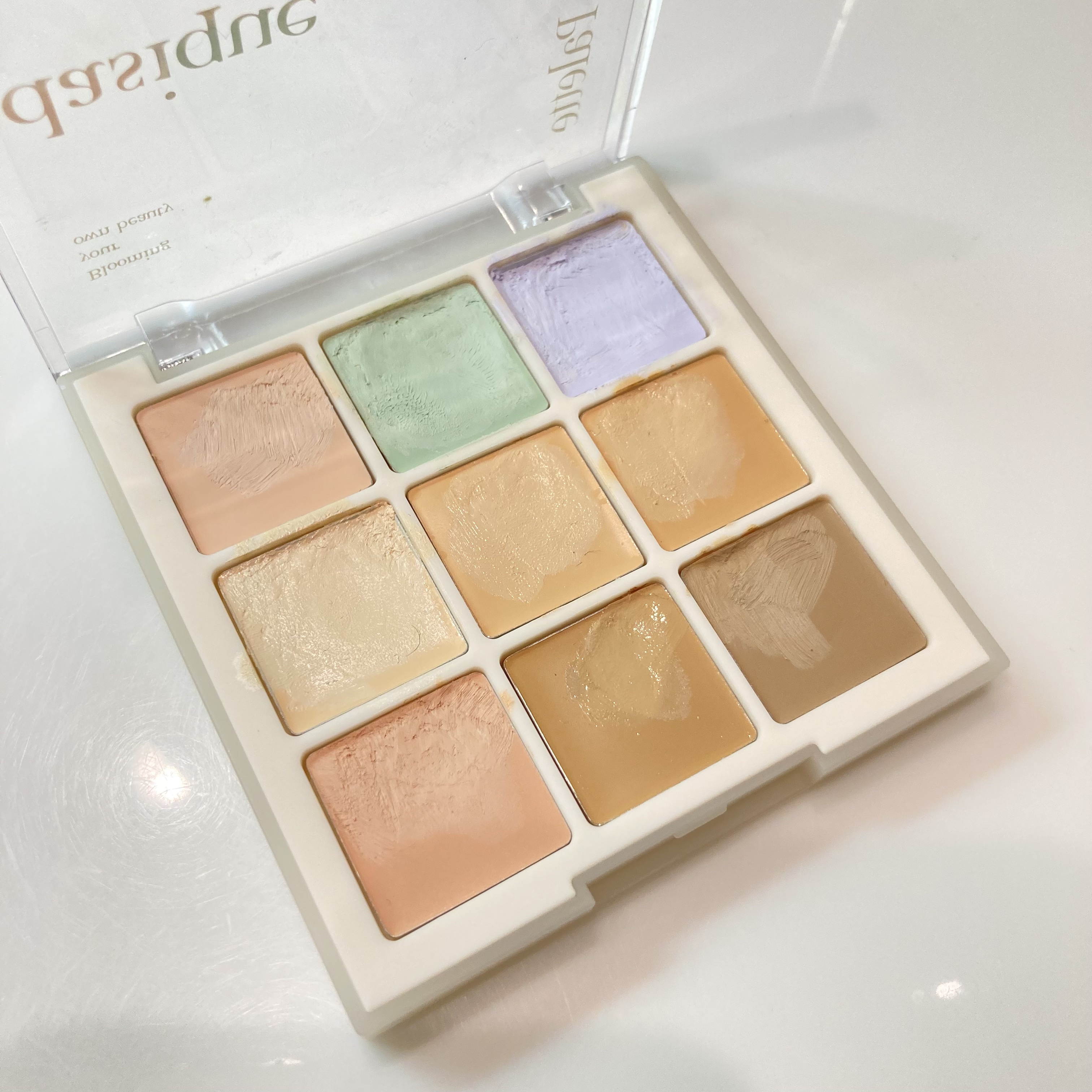 赤、緑、青、茶色の9色のコンシーラーが入ったパレットです 茶色が薄い色から濃い色まで5色あるので、混ぜて使うことにより、大体の肌色は作ることができます 明るい茶色をハイライト代わりに、濃い茶色をシェーディング代わりに使うこともできます!