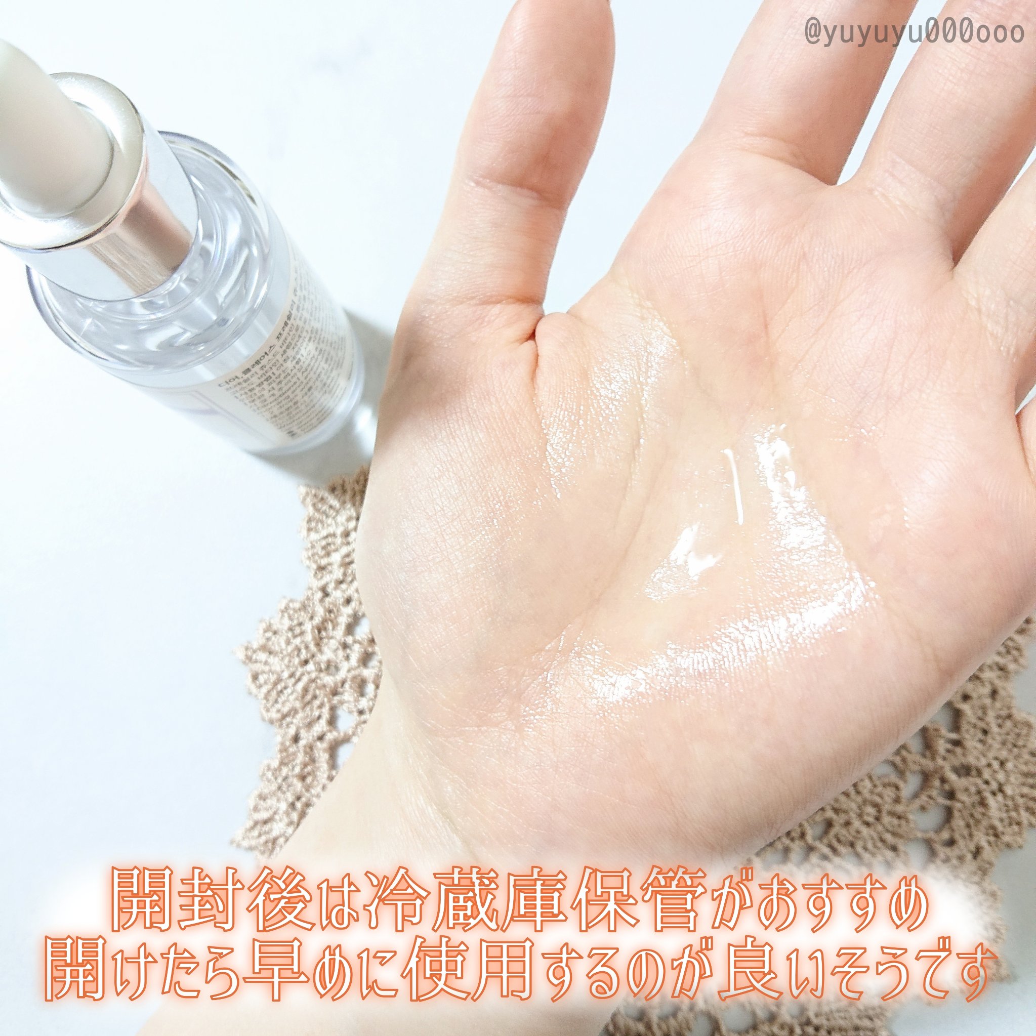 - <35ml> 水、PG、アスコルビン酸、ヒドロキシエチルセルロース、ユズ果実エキス、ツボクサエキス、ポリソルベート60、ダイウイキョウ果実エキス、カリンエキス、ボタンエキス、ブロッコリーエキス、ハス花エキス、グレープフルーツ果実エキス、オウゴン根エキス、BG、グリセリン、オレンジ油、1,2-ヘキサンジオール、(アクリル酸Na/アクリロイルジメチルタウリンNa)コポリマー、イソヘキサデカン、EDTA-2Na、ラベンダー油、チャカルス培養エキス、ポリソルベート80、リン酸2Na、オレイン酸ソルビタン、クリサンテルムインジクムエキス、ウスバサイシン根エキス、モンゴリナラ葉エキス、ヤナギタデエキス、ラリックスエウロパエア木エキス、ホオノキ樹皮エキス、ショウヨウダイオウ根エキス、エンゴサク根エキス、コプチスチネンシス根エキス、リン酸Na、リシンHCl、アスコルビルリン酸Na、アセチルメチオニン、テアニン、プロリン、レシチン、アセチルグルタミン、バチルス/(ダイズ/葉酸)発酵エキス、ヒアルロン酸Na、合成ヒト遺伝子組換オリゴペプチド-1、合成ヒト遺伝子組換オリゴペプチド-2、合成ヒト遺伝子組換ポリペプチド-1、合成ヒト遺伝子組換ポリペプチド-11、合成ヒト遺伝子組換ポリペプチド-9、カプリリルグリコール、リモネン
