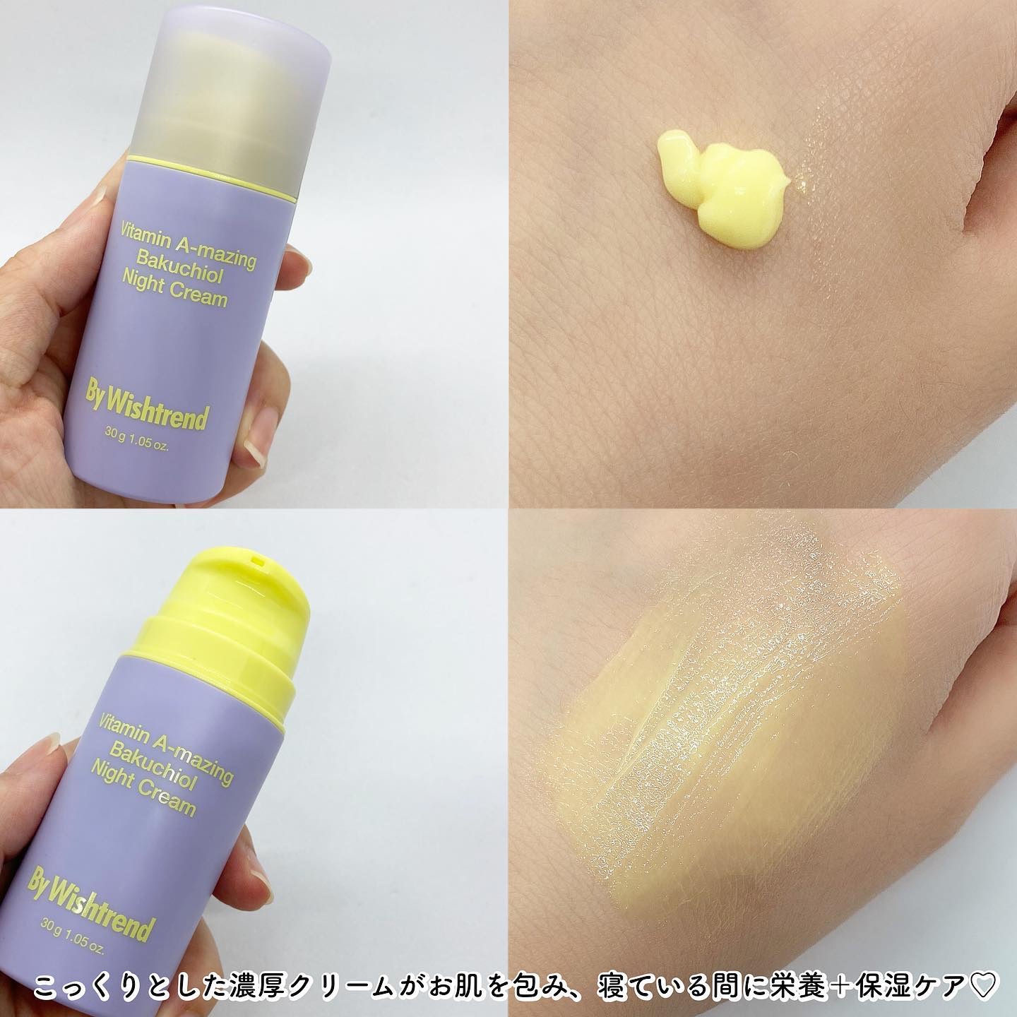 ビタミンA-mazingバクチオールナイトクリーム パッケージが紫と黄色で可愛い💜💛💜 弾力ケア、美白ケア、保湿ケアまで オールカバーできる万能なナイトクリーム💁♀️ 安定的なエアリスポンプを使ってます☝️ 酸化しにくいポンプなのもすごく嬉しいポイントです✨️