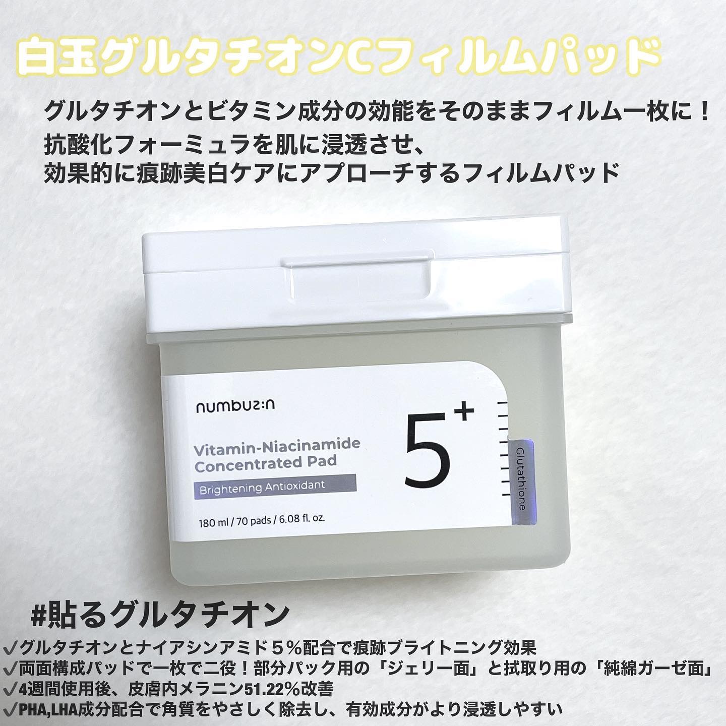 グルタチオン(整肌成分)とビタミン(整肌成分)をそのままぎゅぎゅっと1枚のフィルムパッドに! ぷるんとしたジェリー面でしっかりうるおいケア。ガーゼ面で拭きとりケアができる◎ ベタつかずにうるおい感もしっかりあって私はナンバーズインのパック系ではこの白玉グルタチオンCフィルムパッドが1番お気に入りかも!