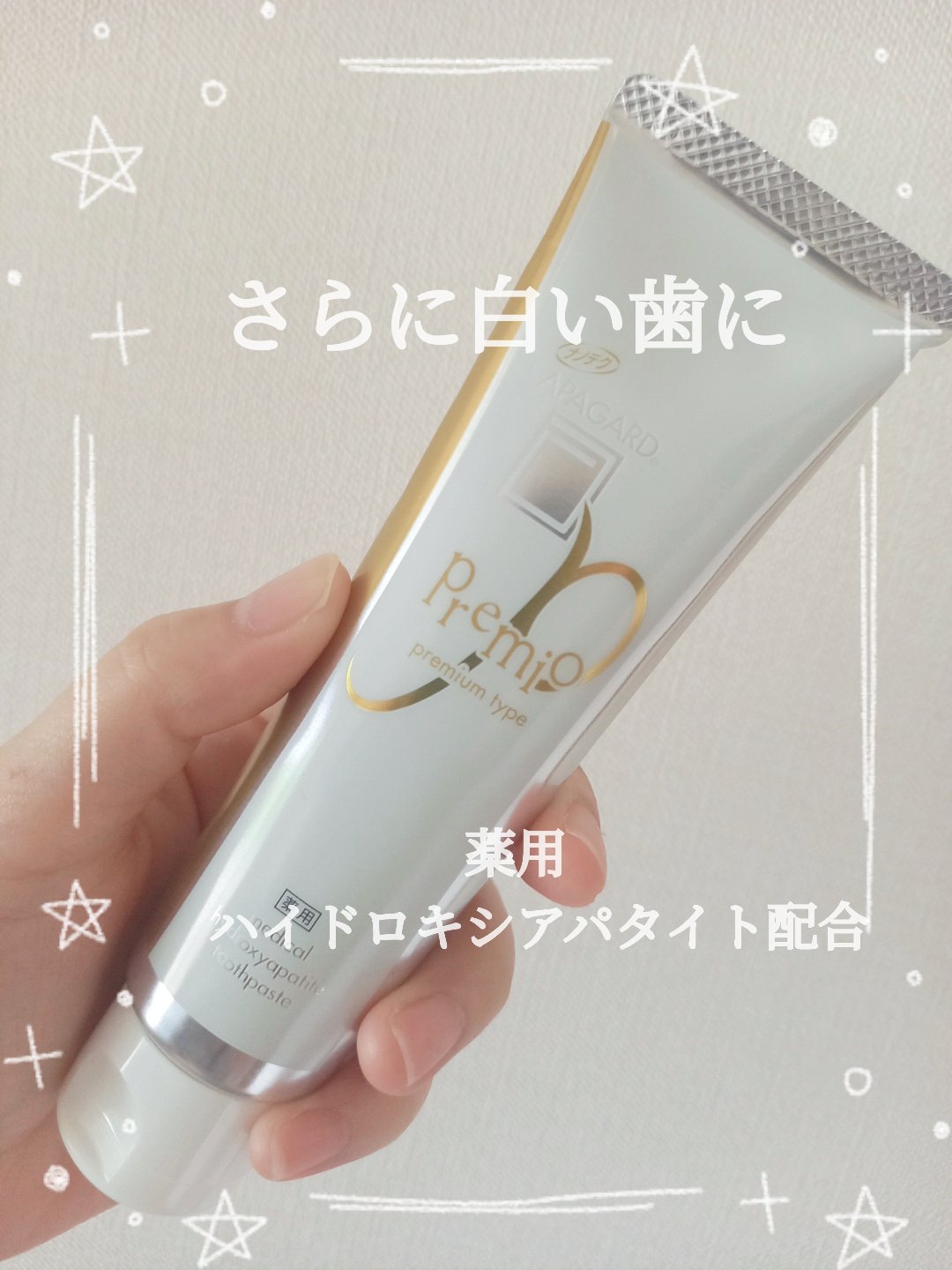 - 【医薬部外品】 独自成分「薬用ハイドロキシアパタイト」がエナメル質を整えてむし歯を予防。アパガードはエナメル質の健康を保つことで自然な白い歯に導く美白歯みがきブランド。アパガードプレミオは「薬用ハイドロキシアパタイト」を高配合(スタンダードタイプ比)。プレミアムケアでときめく白い歯に。 <ライトミント> ●サンギ独自の薬用成分ナノ粒子「薬用ハイドロキシアパタイト」を高配合したプレミアムタイプ。※Mプラス、スモーキン比 ●歯の再石灰化率、白色度もアップ。 ●歯垢を吸着除去し、歯のエナメル質の目に見えない傷を埋め、ミネラル欠損部(初期むし歯)を再石灰化するナノ<mHAP>の3つの働きで、むし歯を予防。 ●パール成分(加水分解コンキオリン液)配合。 <エクストラミント> ●強めのミントがお好みの方におススメ!ミント強めの「エクストラミント」フレーバー。 ●サンギ独自の薬用成分ナノ粒子「薬用ハイドロキシアパタイト」を高配合したプレミアムタイプ。※Mプラス、スモーキン比 ●歯垢を吸着除去、エナメル質表面の目に見えない傷を埋めてなめらかに、エナメル質から溶け出したミネラルを補給(再石灰化)する、という薬用ハイドロキシアパタイトの3つの作用でむし歯を予防。 ●パール成分(加水分解コンキオリン液)を追加したブライトニング処方