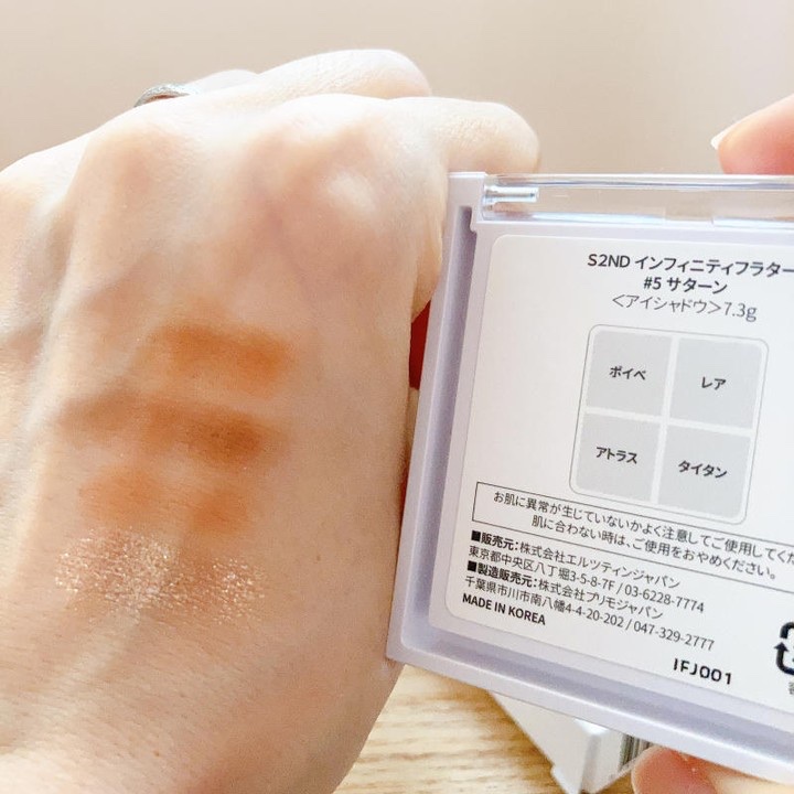 - 無限に煌めくワンタッチテクスチャー。 パーソナルカラーやなりたい印象に合わせて色を選べるアイシャドウパレット「S2ND エスツーエンディー インフィニティフラター」。 スフレのような軽い付け心地。 ひと塗りで均一に広がる柔らかテクスチャーで鮮やかに発色。 粉・ラメ飛びしにくい! 密着感が良く粉飛びを防いでヨレにくいから塗りたての発色が長続き! 捨て色のない4色パレットでメイク初心者でも簡単にアイメイクを楽しめるマルチカラー。