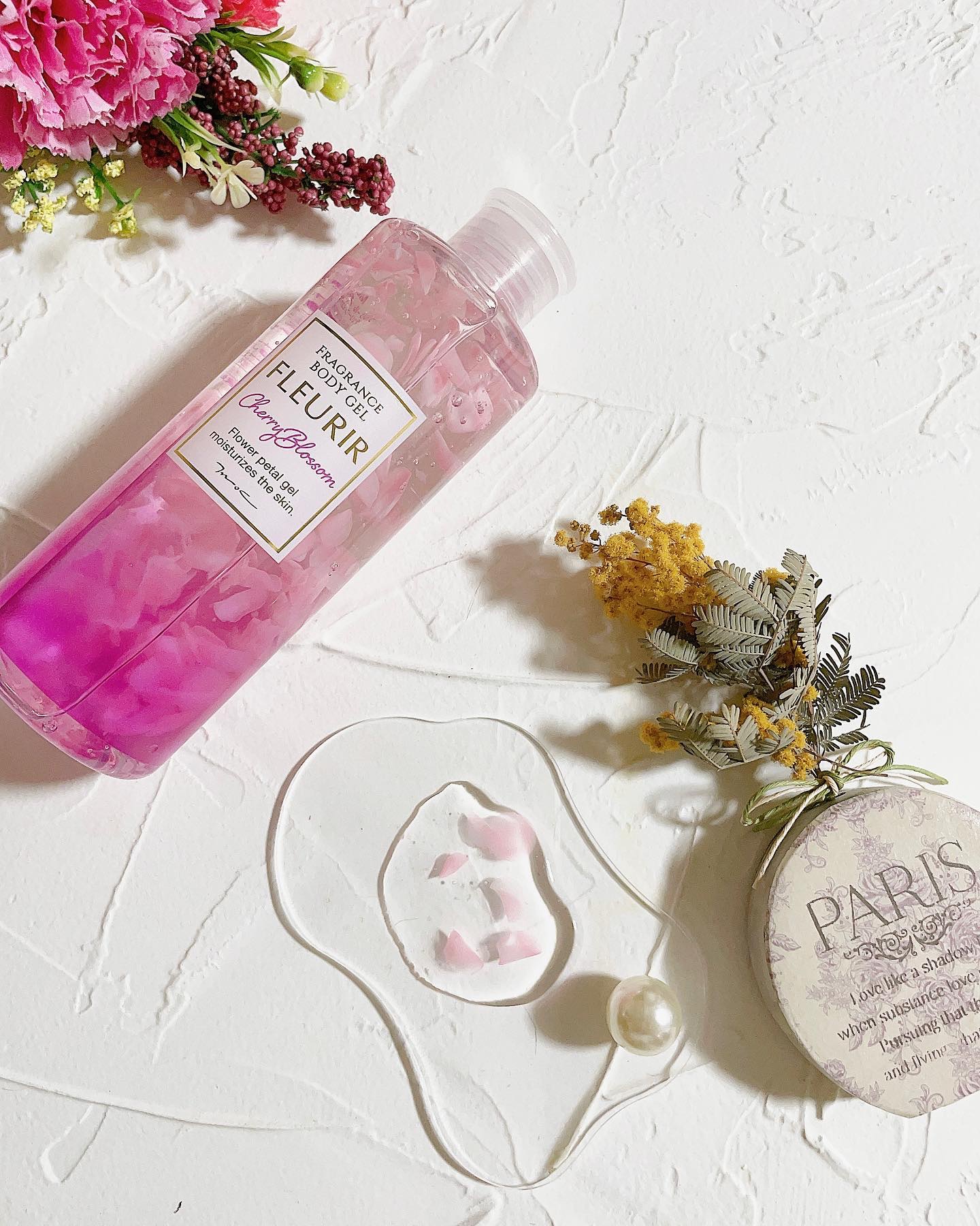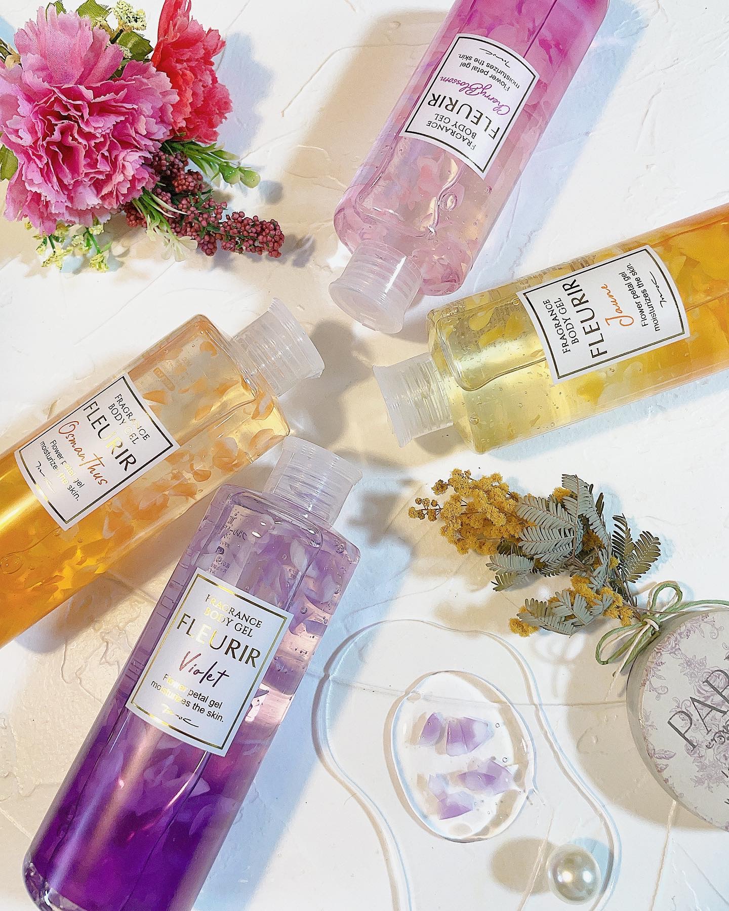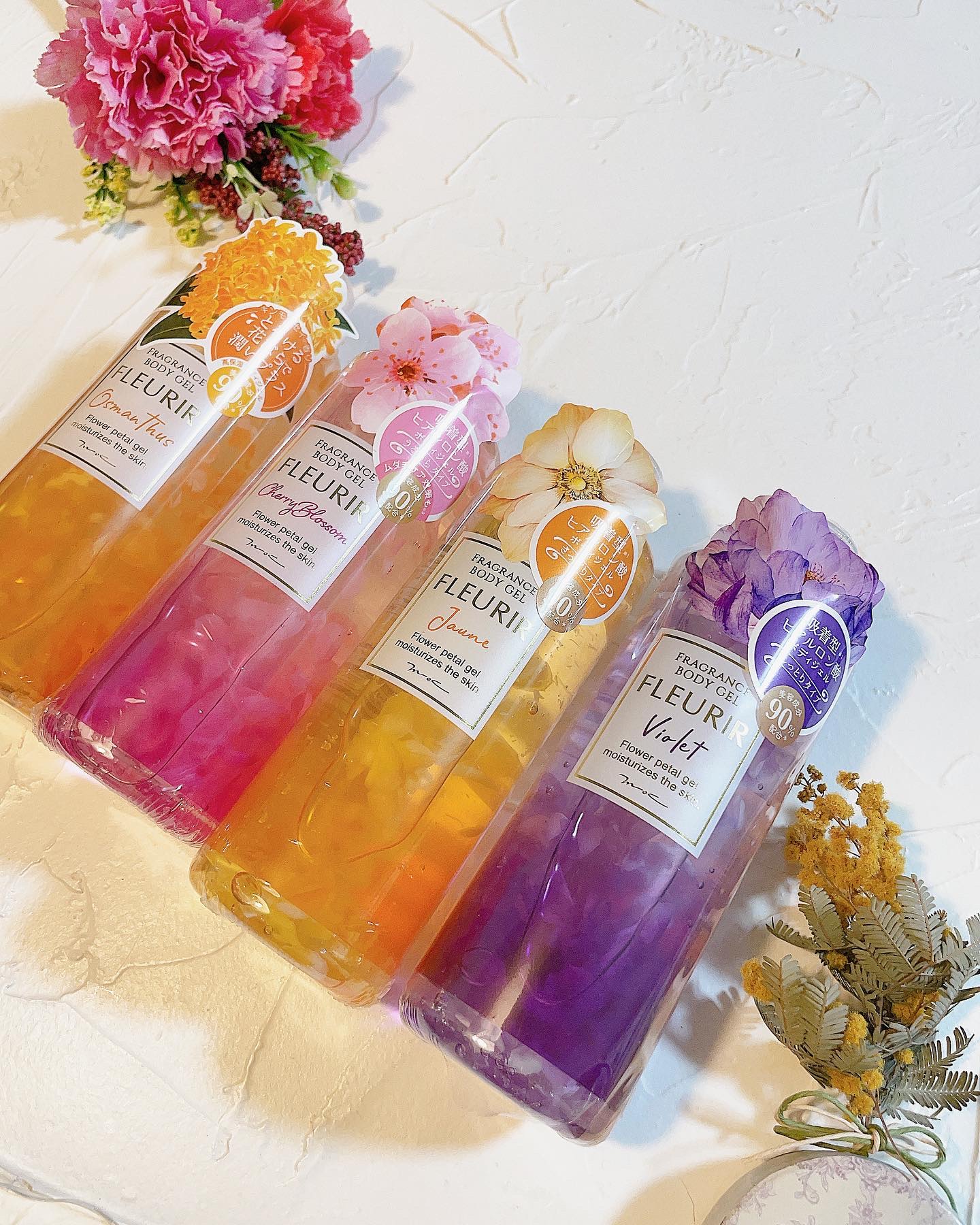 花びら舞う気分の上がるフレグランスボディジェル。 どれも美容成分90%配合でうるおいのあるツヤやかな肌に導きます。 見た目だけでもラグジュアリーな雰囲気に❤️ いつものお風呂上がりのボディケアが一層楽しみに✨ 花びらは本物ではなく花びら状のゲルで、やさしく塗り広げればなじみます! オスマンサス>ヴィヨレ>チェリーブロッサム>ジョーヌ *オスマンサス* 4つの中だと1番しっとり。桃やジャスミンを感じるキンモクセイの香り🧡 *チェリーブロッサム* チェリーやアップルのフルーティーな香りで優しさと華やかさを感じる🩷 *ヴィヨレ* 藤やスイートピーを基調としたフローラルムスクの香り。落ち着いた大人のイメージ💜 *ジョーヌ* ジャスミンや洋梨などを感じる爽やかな香り。4つの中で1番好みの香り💛
