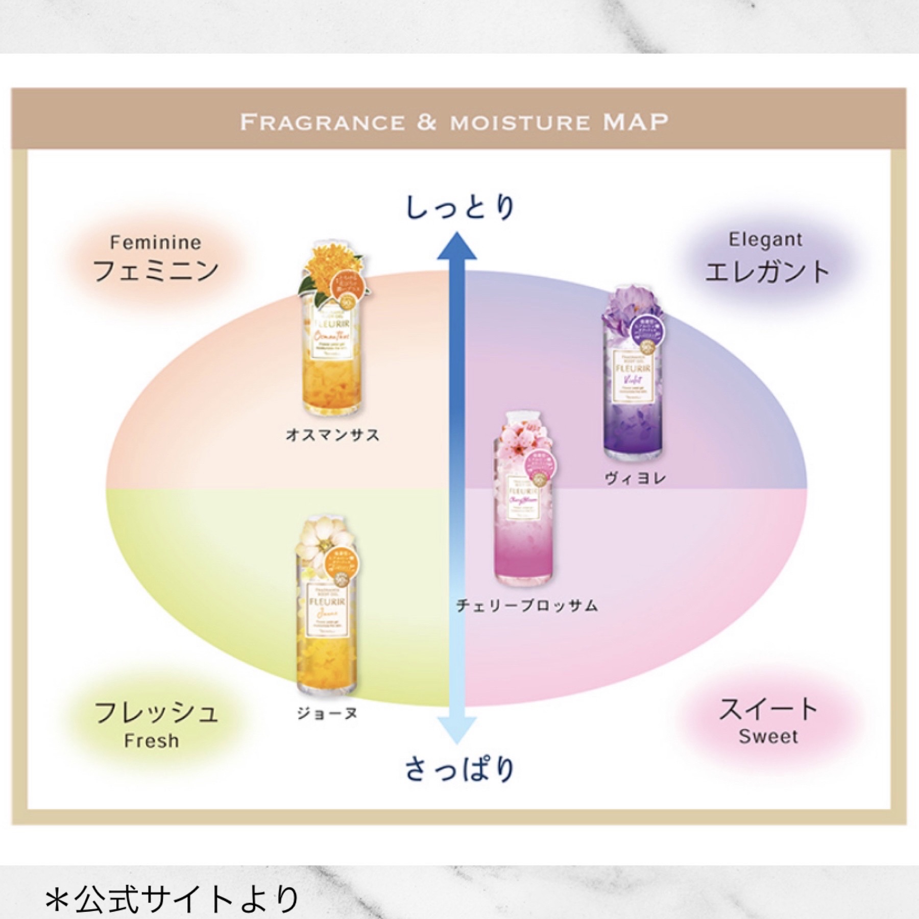 美容成分90%配合で潤ったお肌に導いてくれるそう🥺 4種類あって、高保湿タイプのオスマンサス、しっとりタイプのヴィヨレ、うるさらタイプのチェリーブロッサム、さっぱりタイプのジョーヌから選べるよ😆 どちらもジェルタイプなので、スゥーとお肌に馴染んでベタベタしないよ♪ 花びら状ゲルは、優しく塗り広げることでとろけるようにお肌に馴染む💗 オスマンサスは、桃やジャスミンをプラスした華やかなキンモクセイの香り。 ヴィヨレは、藤やスイートピーを基調とした可憐で上品なフローラルムスクの香り。 チェリーブロッサムは、チェリーやアップルの甘くフルーティーな香りと優しい桜の花の香り。 ジョーヌは、ジャスミンや洋梨を基調とした花々や果実の爽やかな香り。