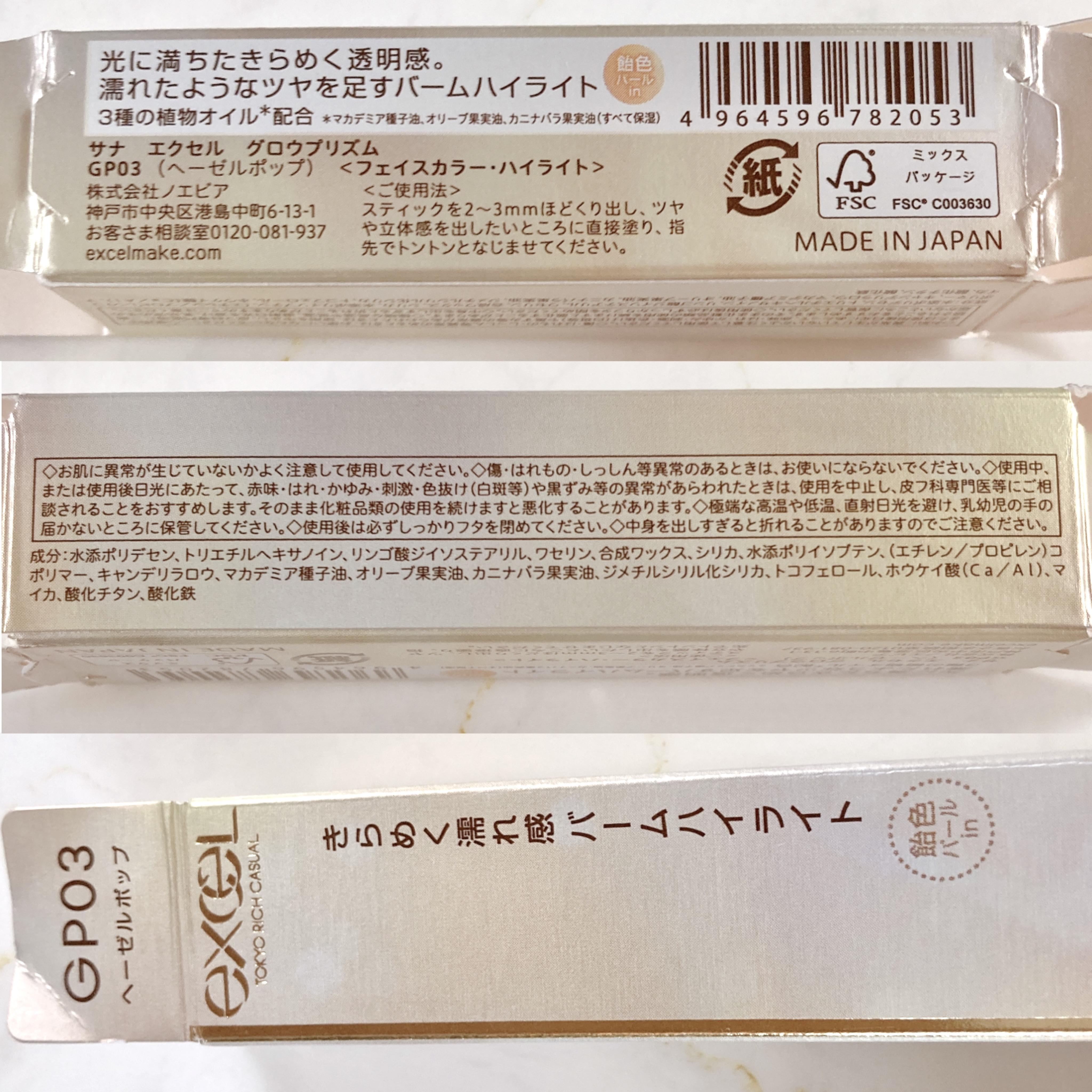 - <GP01 フローラルポップ> 水添ポリデセン、トリエチルヘキサノイン、リンゴ酸ジイソステアリル、ワセリン、合成ワックス、シリカ、水添ポリイソブテン、(エチレン/プロピレン)コポリマー、キャンデリラロウ、マカデミア種子油、オリーブ果実油、カニナバラ果実油、ジメチルシリル化シリカ、トコフェロール、(+/-)ホウケイ酸(Ca/Al)、マイカ、合成フルオロフロゴパイト、酸化スズ、酸化チタン <GP02 マリンポップ> 水添ポリデセン、トリエチルヘキサノイン、リンゴ酸ジイソステアリル、ワセリン、合成ワックス、シリカ、水添ポリイソブテン、(エチレン/プロピレン)コポリマー、キャンデリラロウ、マカデミア種子油、オリーブ果実油、カニナバラ果実油、ジメチルシリル化シリカ、トコフェロール、(+/-)ホウケイ酸(Ca/Al)、マイカ、合成フルオロフロゴパイト、酸化スズ、酸化チタン