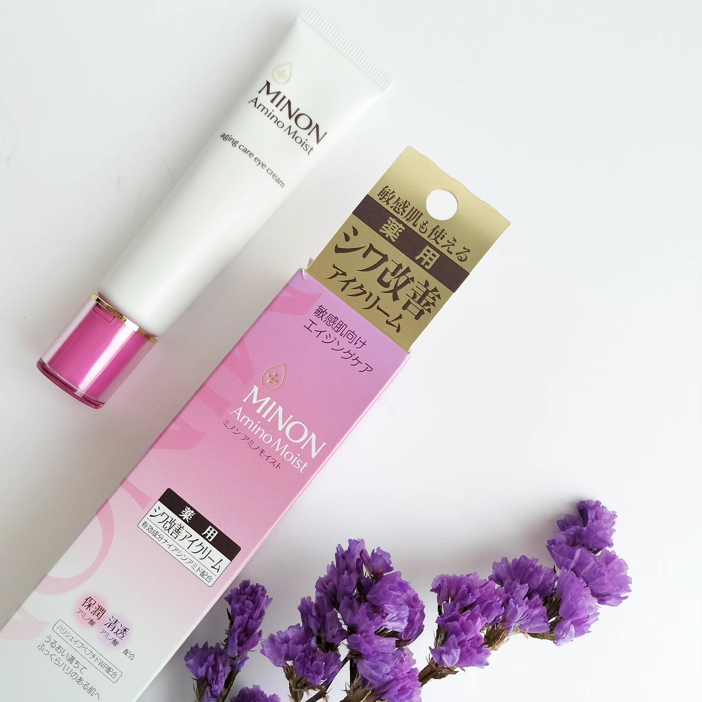 - 【敏感肌も使える薬用シワ改善アイクリーム】 ダブルの有効成分配合。気になるシワを改善し、しみ・そばかす*1、肌あれを防ぎます。 ●ナイアシンアミド:シワ改善&しみ予防 ●グリチルリチン酸2K:肌あれ予防 ハリを与えつや肌に導く「ハリシェイプペプチドWR*2」配合。 使い続けるたび、シワを改善し、うるおってハリのある明るい印象の目元へ。 エイジングケア:年齢に応じたお手入れケア *1メラニンの生成を抑え、しみ・そばかすを防ぐ *2ヤシ油脂肪酸水解コラーゲンK (販売名:ミノンアミノモイストAE)【医薬部外品】