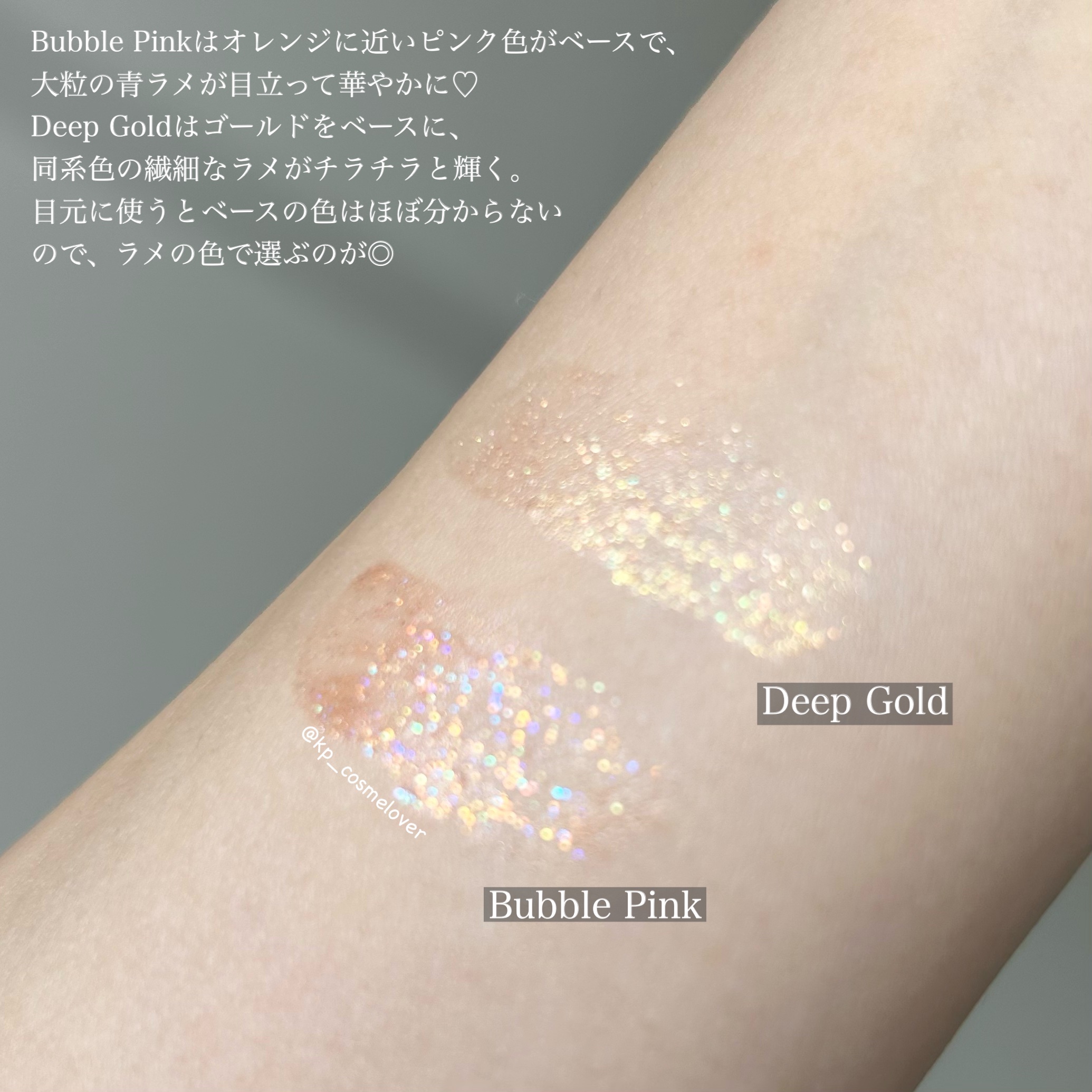 六角形のヘキサラメを使用していて通常のラメよりもキラキラなグリッター キラキラかわいいのはもちろん、皮膚の薄い目元に使用するのでシカ成分が配合されていて肌荒れを防止したり、肌の弱い方でも使いやすい嬉しいポイント チップタイプで広範囲にも塗りやすくみずみずしい使い心地ですが乾くとしっかりラメが密着してくれるので夕方までキラキラでした。