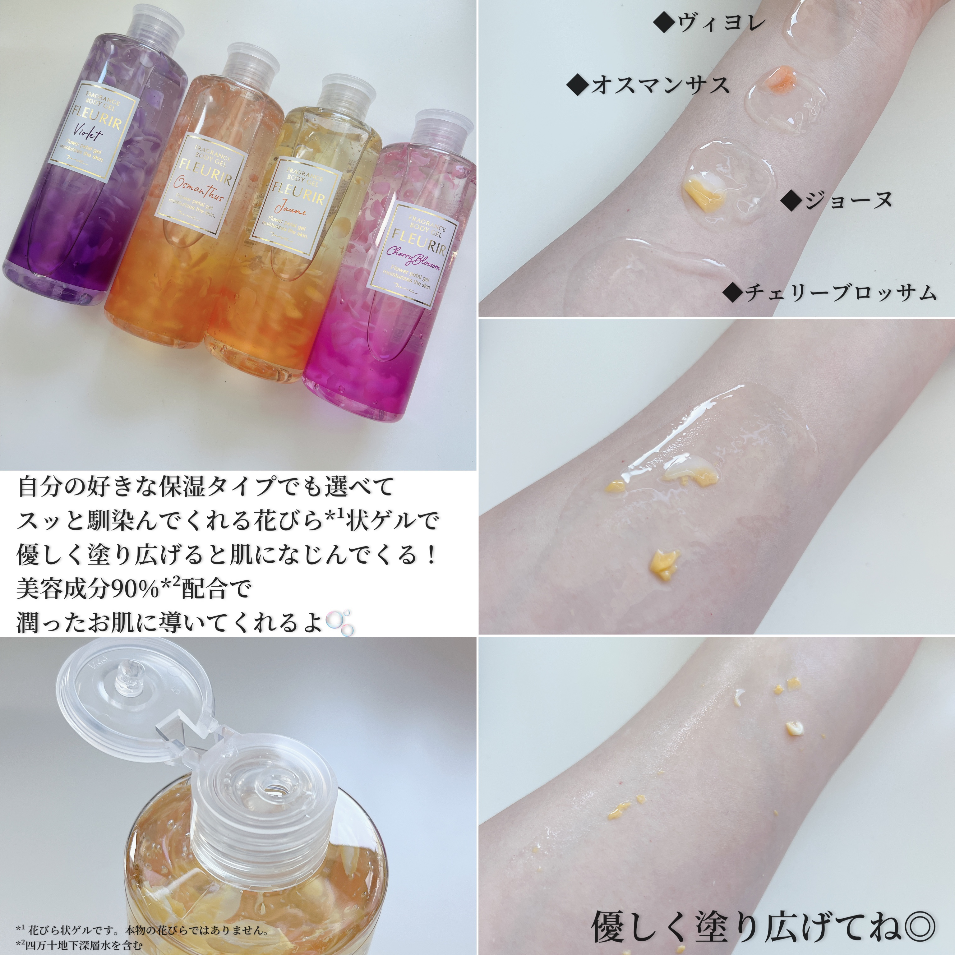 美容成分90%配合で潤ったお肌に導いてくれるそう🥺 4種類あって、高保湿タイプのオスマンサス、しっとりタイプのヴィヨレ、うるさらタイプのチェリーブロッサム、さっぱりタイプのジョーヌから選べるよ😆 どちらもジェルタイプなので、スゥーとお肌に馴染んでベタベタしないよ♪ 花びら状ゲルは、優しく塗り広げることでとろけるようにお肌に馴染む💗 オスマンサスは、桃やジャスミンをプラスした華やかなキンモクセイの香り。 ヴィヨレは、藤やスイートピーを基調とした可憐で上品なフローラルムスクの香り。 チェリーブロッサムは、チェリーやアップルの甘くフルーティーな香りと優しい桜の花の香り。 ジョーヌは、ジャスミンや洋梨を基調とした花々や果実の爽やかな香り。