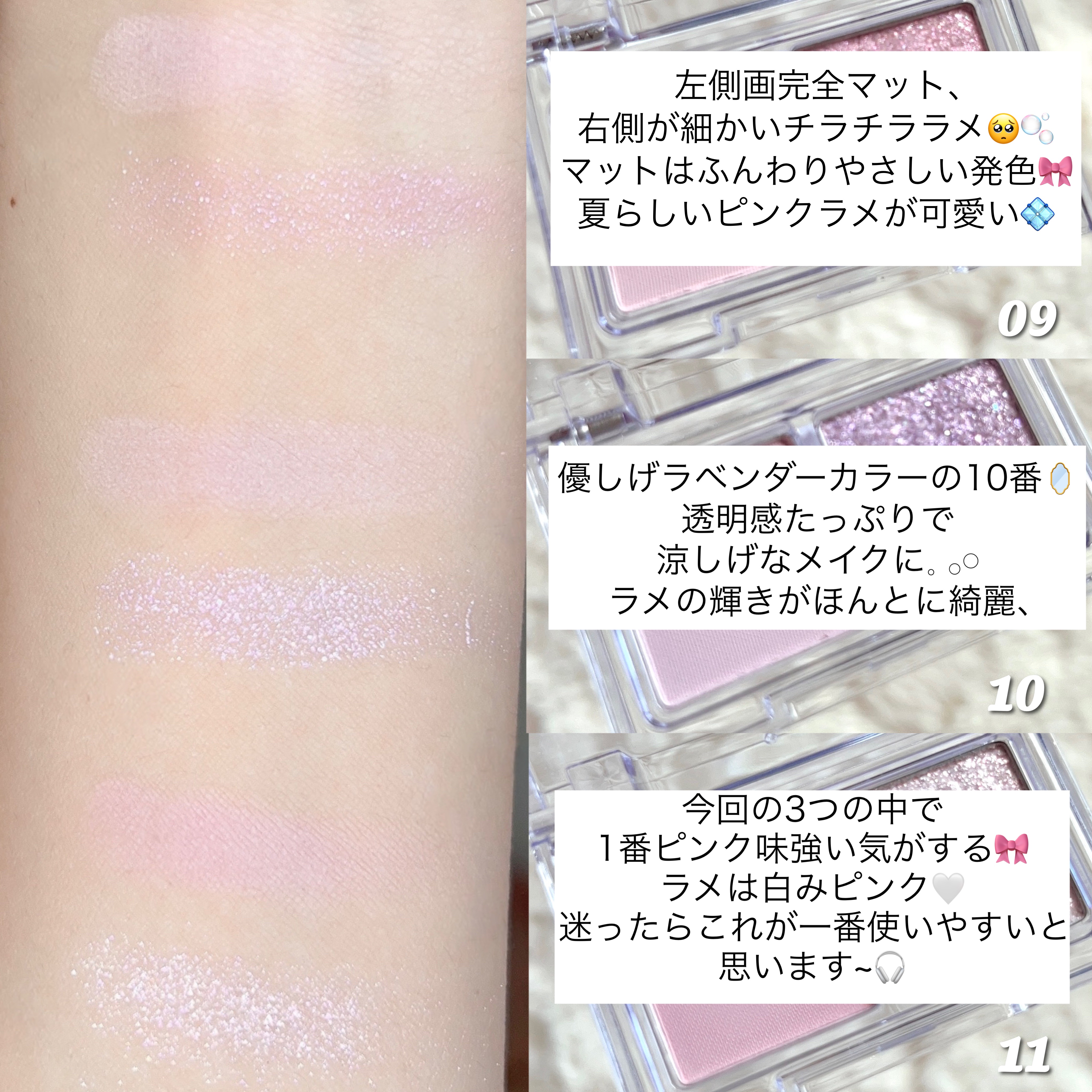 画像で1.2番の色は、5色の中でも特に発色が弱めなので、より自然に仕上げたい方はこの2色をメインに使うのがオススメ!💡 今回ご紹介した05は、クセのない、使いやすい色ばかり入っていたので、初心者さんも使いやすいと思います🤍 粉質もパサパサせず使いやすいし、税込1000円以下でこれが買えるのはかなりお得だとおもいます❤️🔥