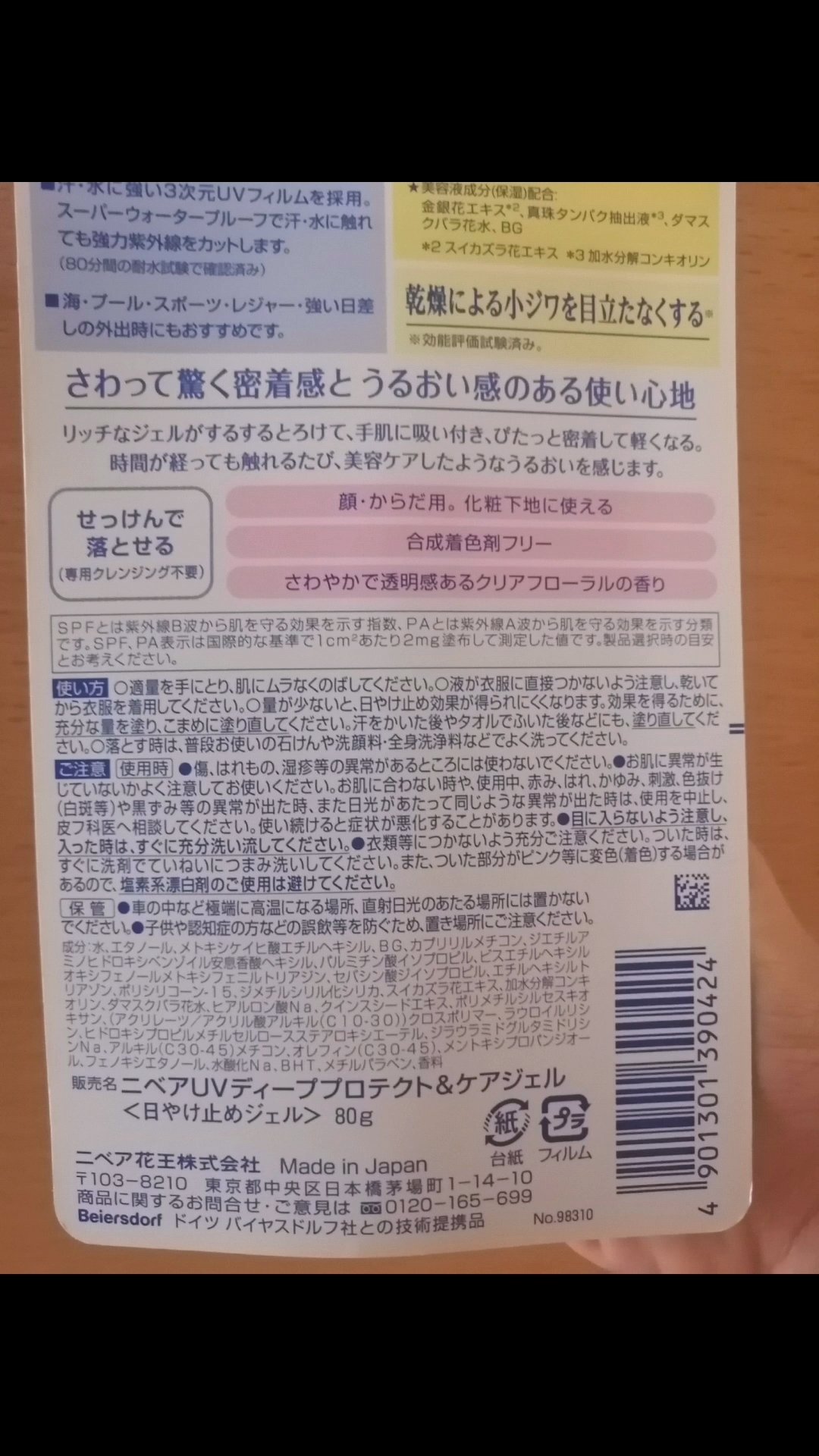 ニベアUVディーププロテクト&ケアジェル顔&身体の全身に使えます✨SPF50+/PA++++日やけによるシミ、そばかすを予防...加えて美容ケアまで👍汗・水に強いスーパーウォータープルーフ👍早速、使ってみると.....適量を手に取りまんべん無...