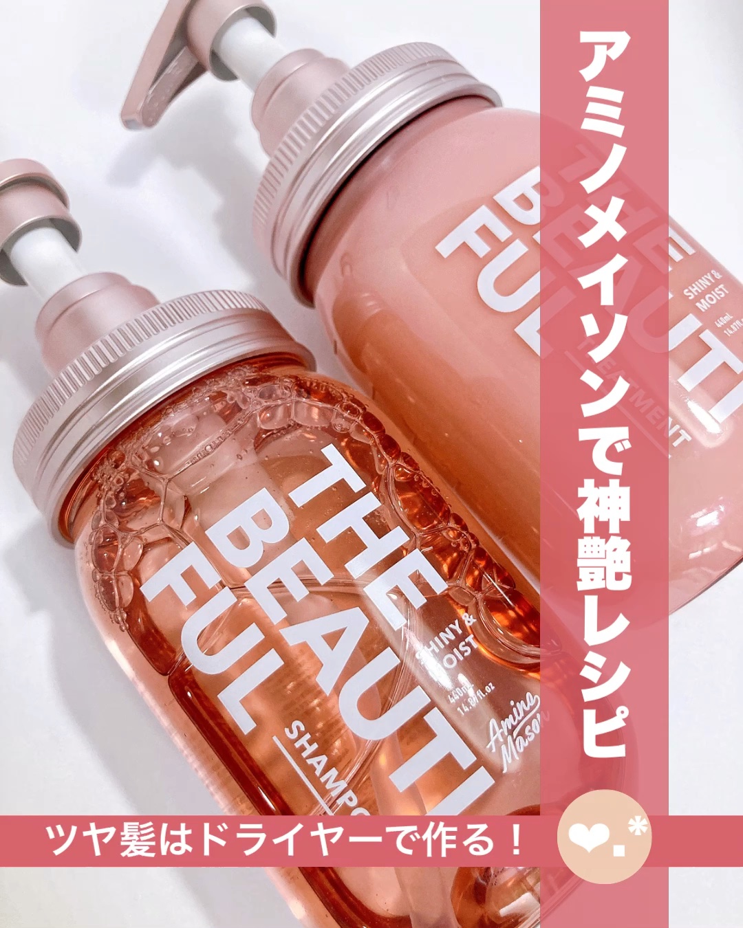 - 髪の印象変わる*1、神艶*2レシピのシャンプー&トリートメント。 コールドプレスのパワーシードオイル*3×NEOスーパーアミノ酸ブレンドで、うねり・広がり・パサつきによる髪ストレスもフリーに。 艶やかで毛先までしっとりまとまる髪へと導きます。 豊かな泡立ちのシャンプーで不要な皮脂や汚れをすっきり落として健やかな地肌環境へ整え、トリートメントで髪を包み込むように潤いでコーティングしダメージを補修。 まるで髪の質感*1が変わったような、私らしい美しい髪へと導きます。 ゼラニウム&ローズの香り。 *1 潤い・まとまりなどの髪の仕上がりや手触りのこと *2 当社比 *3 プルケネチアボルビリス種子油、ホホバ種子油、テリハボク種子油、スクレロカリアビレア種子油/ブロッコリー種子油、スイカ種子油、プルーン種子油[アミノメイソン シャイニー & モイスト シャンプーに配合]/オプンチアフィクスインジカ種子油、ヒマワリ種子油[アミノメイソン シャイニー & モイスト ヘアトリートメントに配合]