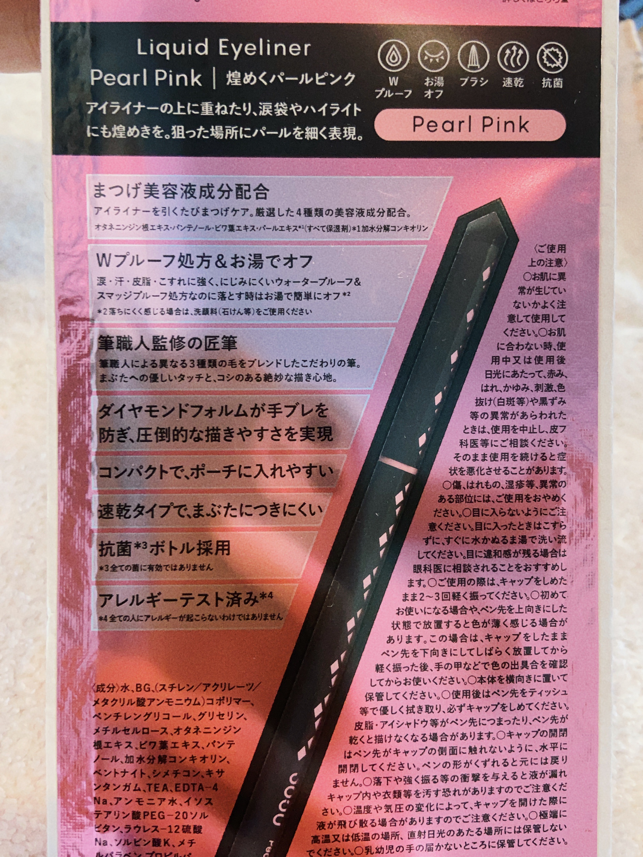 - 〇まつげ美容液成分配合 アイライナーを引くたびまつげケア。厳選した4種類の美容液成分配合。 オタネニンジン根エキス・パンテノール・ビワ葉エキス・パールエキス*1(すべて保湿剤) 〇Wプルーフ処方&お湯でオフ 涙・汗・皮脂・こすれに強く、にじみにくいウォーター プルーフ&落とす時はこすらずお湯オフできる スマッジプルーフ処方 〇筆職人監修の匠筆 筆職人による異なる3種類の毛をブレンドしたこだわりの筆。 まぶたへの優しいタッチと、コシのある絶妙な描き心地。 〇ダイヤモンドフォルムが手ブレを防ぎ、こだわりの描きやすさを実現 〇コンパクトで、ポーチに入れやすい 〇速乾タイプで、まぶたにつきにくい 〇抗菌*2ボトル採用 〇アレルギーテスト済み*3 〇独自開発素材 VIRUTEXを採用 抗菌効果を持つVIRUTEX を使用した容器で、樹脂からの抗菌成分溶出により、菌の検出を防止します。*すべての菌に有効性を示している訳ではありません。(抗菌性試験(JIS)による判定) ご使用中に付着した汚れは拭き取って、清潔に保ってください。 *1加水分解コンキオリン *2全ての菌に有効ではありません *3全ての人にアレルギーが起こらないわけではありません <カーキ(Khaki)> モードカーキ 肌なじみがよく普段のメイクにアクセントを加えた仕上がり。モードでかっこよく上品な印象の目元に。 <グレー(Gray)> 柔らかニュアンスグレー 黒よりもインパクトが強すぎず、ブラウンほど柔らかすぎないナチュラルな仕上がり。 <シアーブラウン(Sheer Brown)> 仕込みシアーブラウン こっそり仕込むコントゥアラインで目元に立体感。二重強調ラインや涙袋の影に。 <シアーレッド(Sheer Red)> 血色感シアーレッド 内側からにじみでるような血色感。涙袋の影やベースに引くことでうさぎメイクに。 <バーガンディー(Burgundy)> 目元染めるバーガンディー 目元に血色感を与えるカラー。ひと筆で体温が上がったような、きれいであたたかさのある仕上がり。 <パールピンク(Pearl Pink)> 煌めくパールピンク アイライナーの上に重ねたり、涙袋やハイライトにも煌めきを。狙った場所にパールを細かく表現。 <ブラウンブラック(Brown Black)> 王道ブラウンブラック 黒だと強すぎ。でもブラウンじゃ物足りない。ぬくもりと凛々しさの絶妙の色バランス。 <ブラック(Black)> 定番ブラック 黒目の印象をどこまでも引き立てる、引き締めブラック。 <ホワイト(White)> 目元拡張ピュアホワイト 拡張色で大きな目元を演出。しっかり発色するホワイト。抜け感あるピュアな印象に。