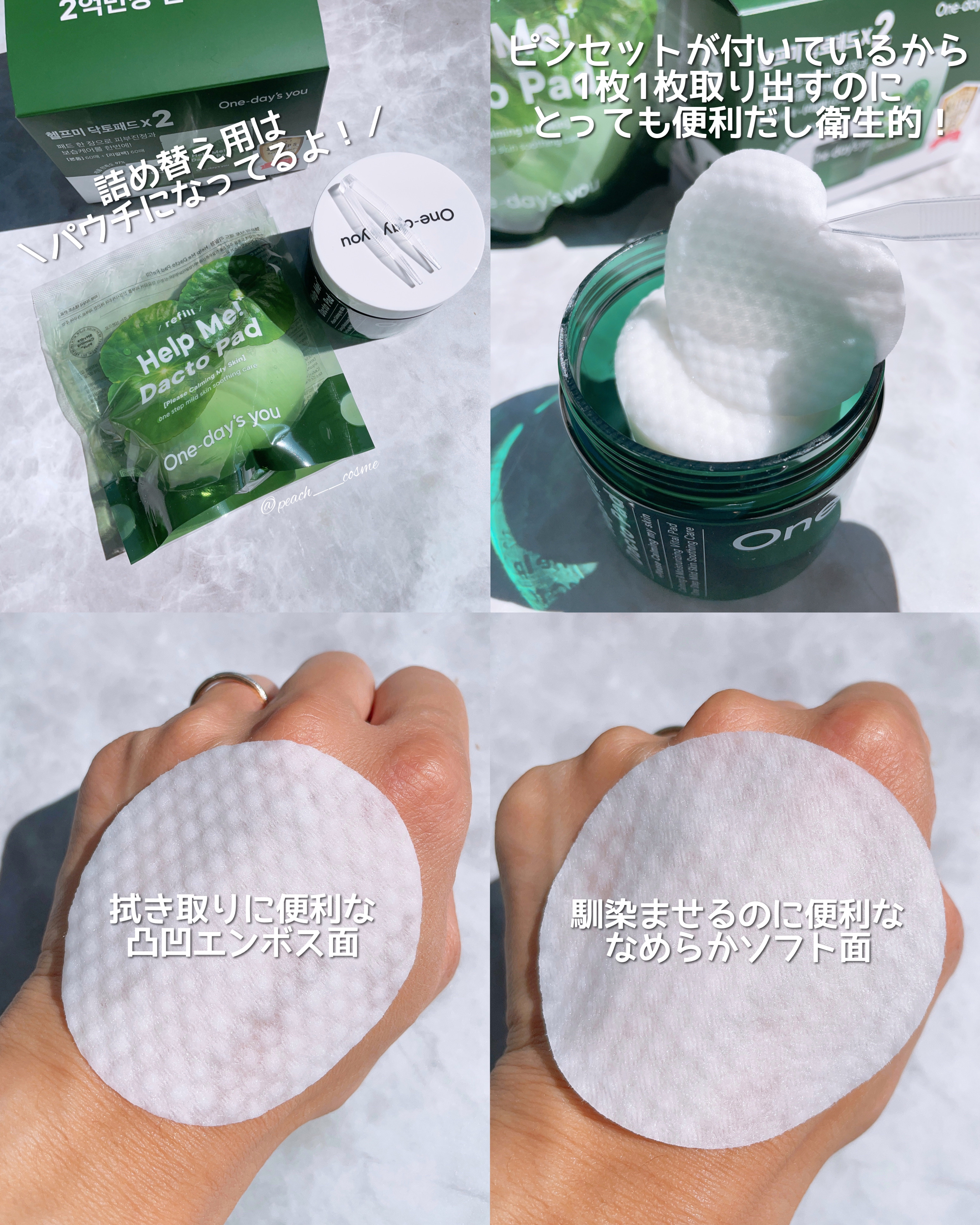 One-day'syouヘルプミー!ダクトパッド60枚提供いただき使ってみました。ツボクサエキス配合の鎮静系トナーパッド。保湿、角質ケアにも。凸凹面で拭き取り、平たい面でパック。ベタつきナシ。ハーブっぽい香りがしますが嫌な匂いではないです。洗...