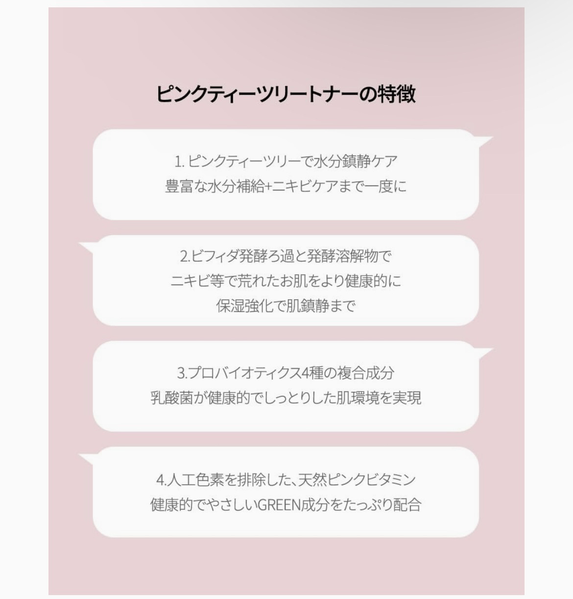 APLINで人気のピンクティーツリーシリーズの化粧水。ティーツリー成分やCICA成分を配合し、肌を落ち着かせ健やかに整える働きが期待できます。 さらりとしたテクスチャーで、ベタつき・ヌルつき感はありません。軽やかで、なじませると肌にぐんぐん吸い込まれていく感じ✨ 大人可愛い見た目で使っていて気分も上がるし、お花をイメージするようないい香りも◎!