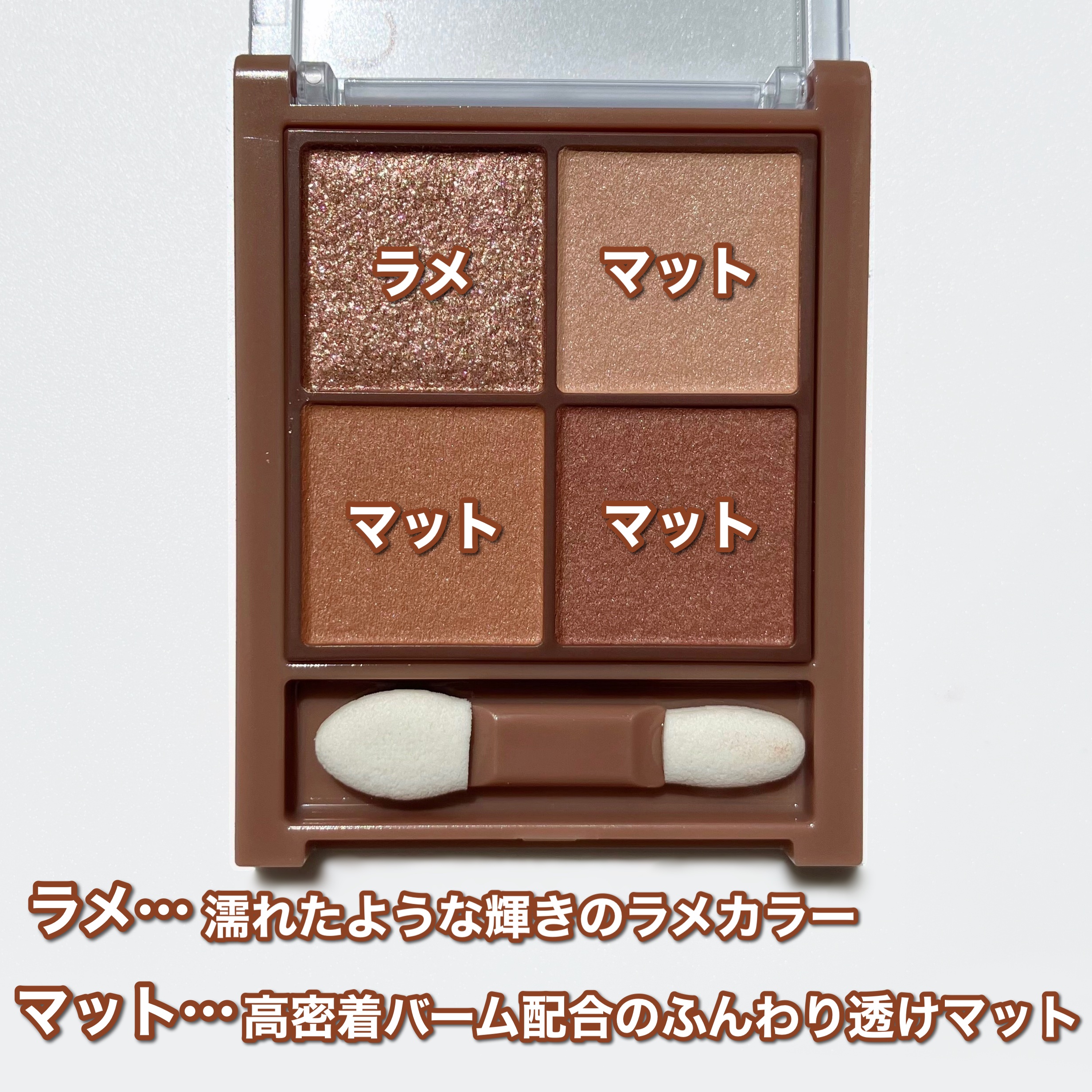 - 透け感マット×濃厚ブラウンの4色アイシャドウ。 しっかり目元を引き締めるビターなブラウンカラー。 透け感のあるブラウンを重ねて、自然な陰影のある目元へ。 ふんわり柔らかなパウダーなので、スルスル伸びてまぶたにピタッと密着。 保湿成分(スクワラン、ホホバ種子油)配合。