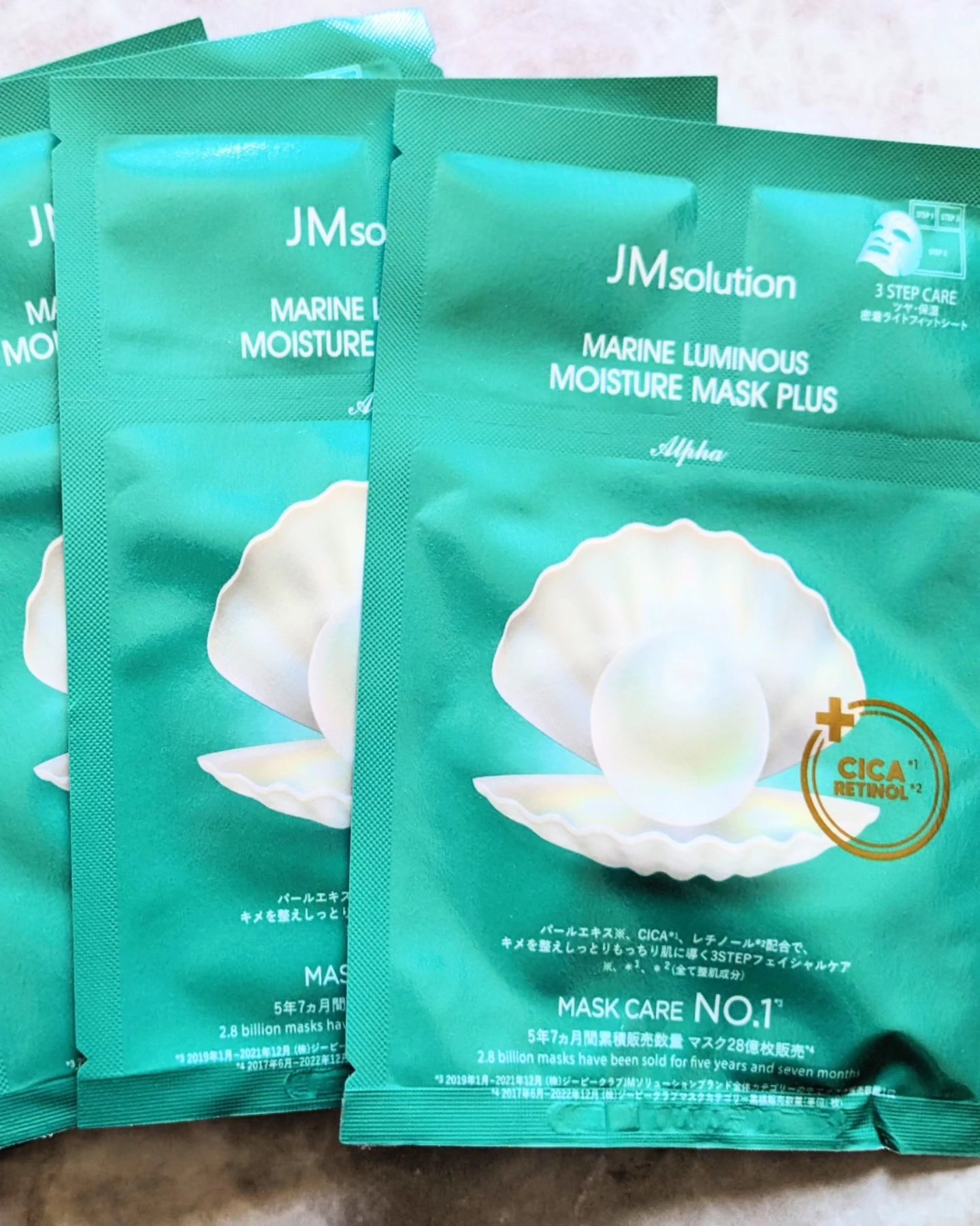 JM solutionの Marine luminous pearl deep moisture mask。もらった時は普通のマスクだと思ってたけどよく見てみたら3ステップが1枚になったマスクだった〜! ステップ2 シートマスク 密着が良い! けど目の穴が大きすぎて私のケアしたい目尻あたり、は保湿ケアのカバーできず。 お肌は朝まで調子が良かったのでお泊まりに持って行くとき用にいくつかストックしておきたいなと思いました!