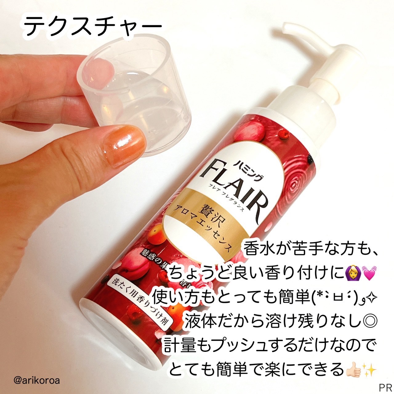 - 柔軟剤と一緒に入れるだけ、香り贅沢にグレードアップ! いつもの柔軟剤にアロマエッセンスが溶け合って、 贅沢にグレードアップした香りが楽しめます。 ●グレードアップした香り続く ●液体だから溶け残りなし ●計量いらず!プッシュタイプ(約110プッシュ分) ●柔軟剤との組み合わせ自由 <魅惑の果実の香り> ピーチ、アプリコット、ラズベリーに、華やかなローズを 組み合わせた上品な甘さにグレードアップ!