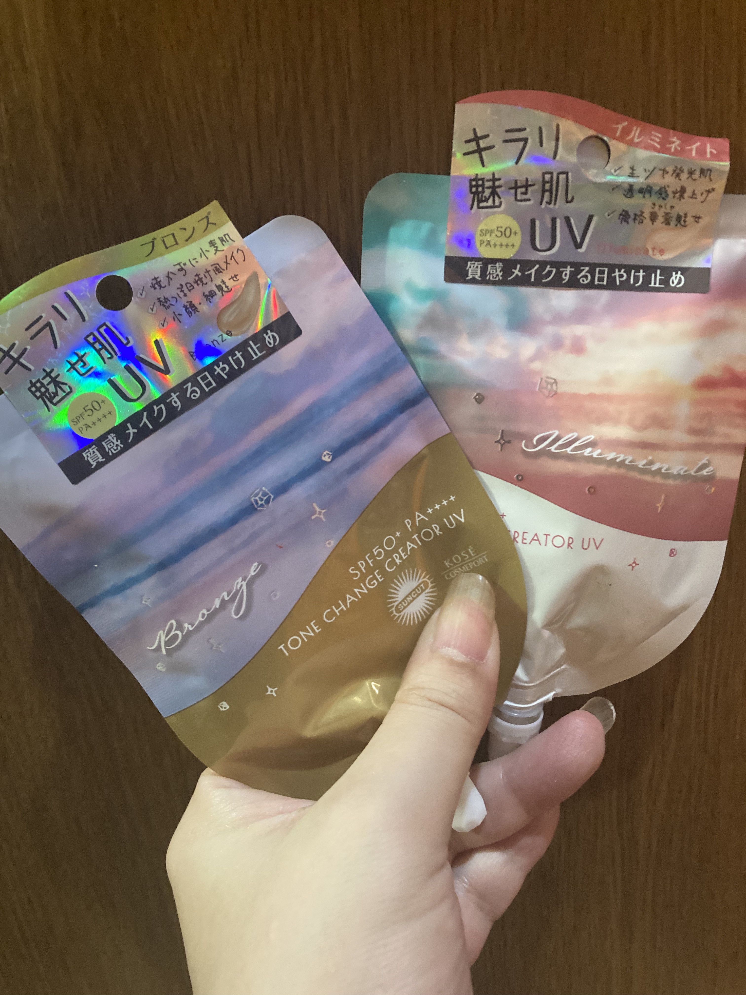 こんなにもしっかり色がついてる日焼け止めって初めてみた…! ブロンズはまるで日サロで焼いたみたいな綺麗な小麦肌にカラーチェンジ🤎 簡単に日焼け風メイクも楽しめてオレンジ系のアイメイクやリップが綺麗に映える🍊✨ イルミネイトはキラキラ反射する発光肌に🪞💎 白ベースにオーロラパールが配合されているから"ラメ"!!って感じの肌に。 透明感が爆上がりして骨格を華奢見せする効果も◎ 普通の日焼け止めに飽きたら周りとは一味違う日焼け止めを使うのもおすすめ♥⸝⸝